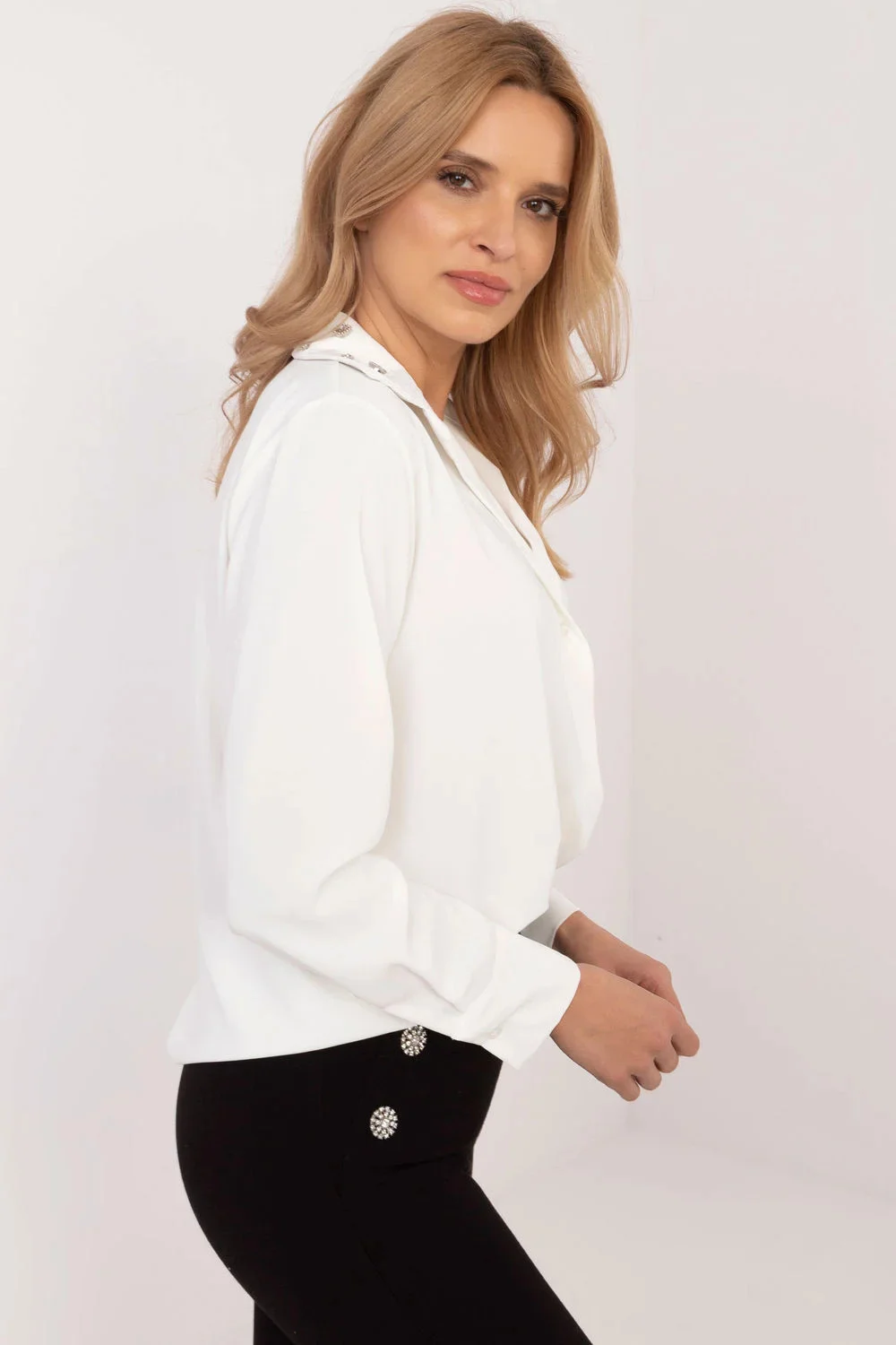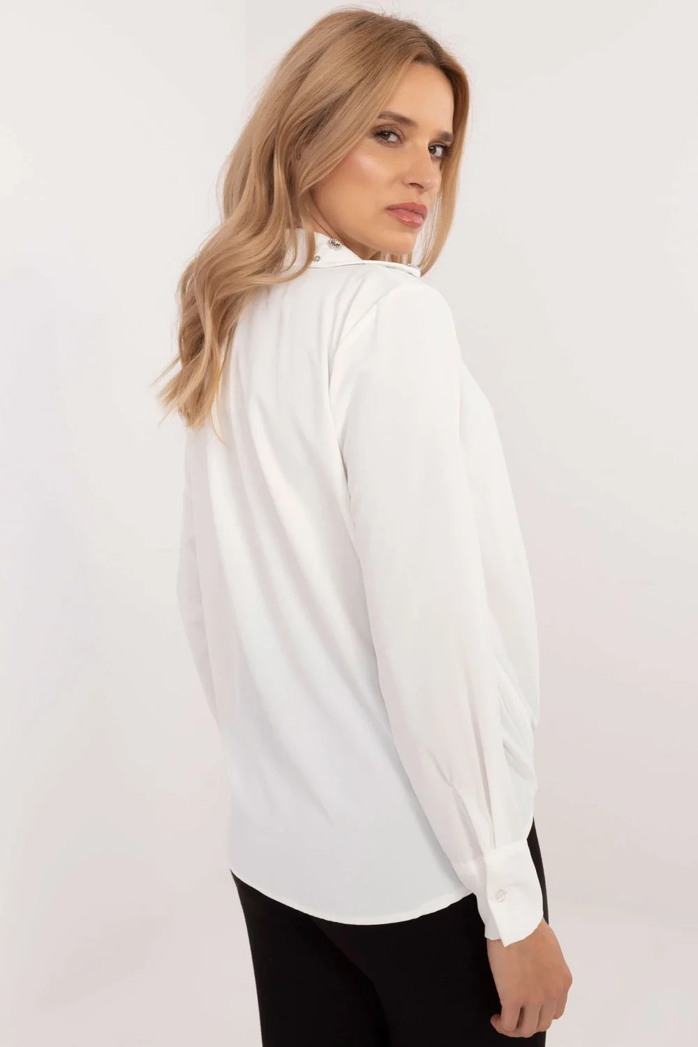 Dámská košile s klasickým střihem, ideální na elegantní příležitosti a do každodenního pracovního stylu. Vyrobená z kombinace polyesteru a viskózy, díky čemuž je pohodlná a odolná. Hladký materiál jí dodává univerzálnost, umožňuje snadné sladění s různými outfitmi a doplňky. Standardní délka a dlouhý rukáv zajišťují pohodlí a profesionální vzhled. Košile má jemný límeček zdobený decentními zirkony, co jí dodává výjimečný elegantní charakter. Zapíná se na klasické knoflíky a je skvělou volbou jak na formální události, tak do každodenní práce, dodávající styl a eleganci každému outfitu.