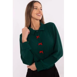 Elegantní dámská košile je výjimečnou volbou pro ženy, které si váží klasického stylu s decentním, dekorativním akcentem. Vyrobená z hladké směsi polyesteru a elastanu poskytuje pohodlí nošení, odolnost a skvělé padnutí. Standardní délka a klasický límec zdůrazňují univerzální charakter modelu. Zapíná se na knoflíky skryté pod listem, košile vypadá mimořádně upraveně a stylově. Ozdobné mašličky na přední straně umístěné podél řady knoflíků jí dodávají rafinované kouzlo, skvěle zapadající do elegantních stylizací. Dlouhé rukávy zakončené manžetami dokreslují elegantní vzhled. Je to skvělá volba na společenské události, do práce nebo na večerní vycházky. Košile skvěle ladí s elegantními kalhotami, sukněmi nebo oblekem, nabízí mnoho možností vytvoření výjimečných stylizací, které kombinují eleganci s nádechem originality.