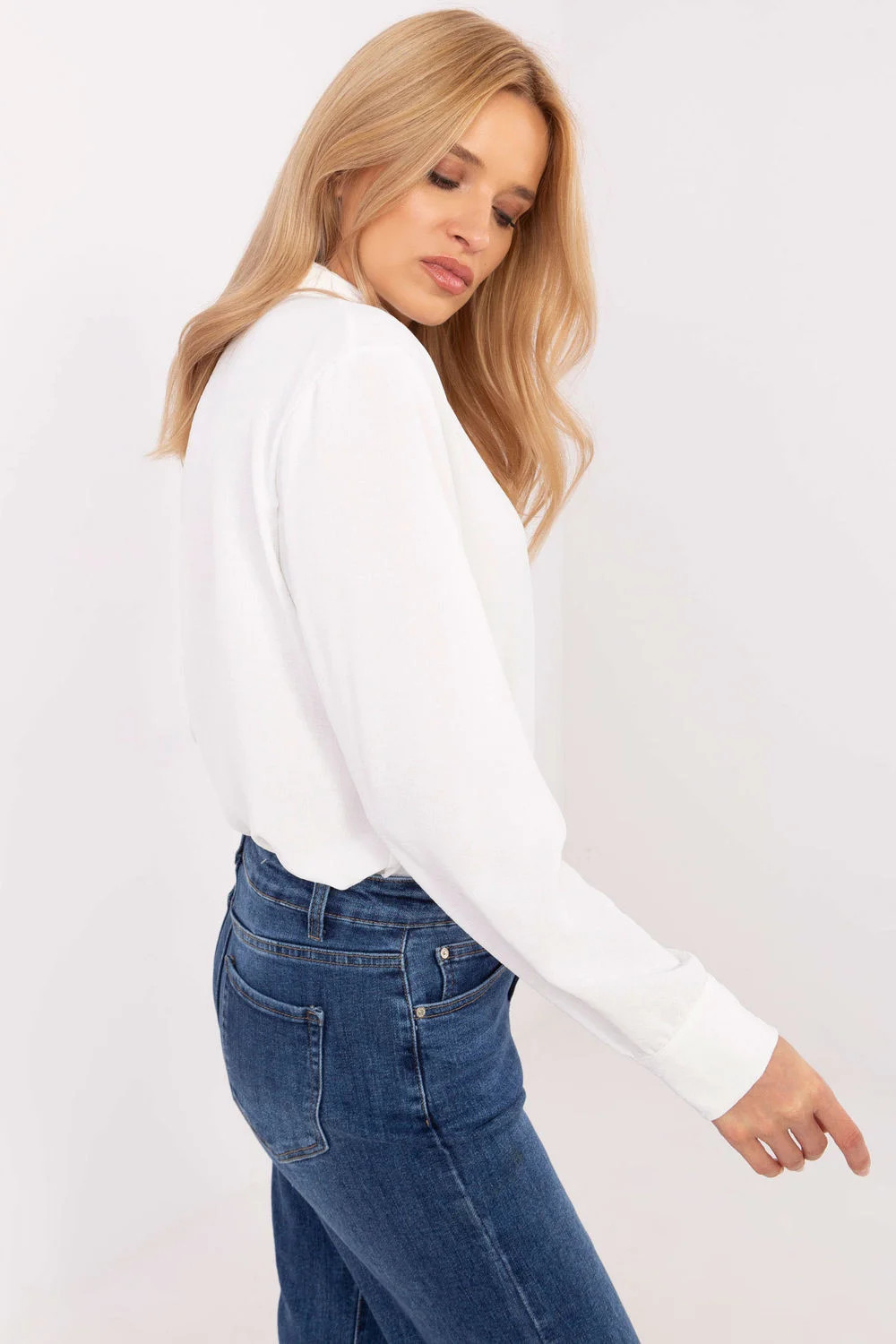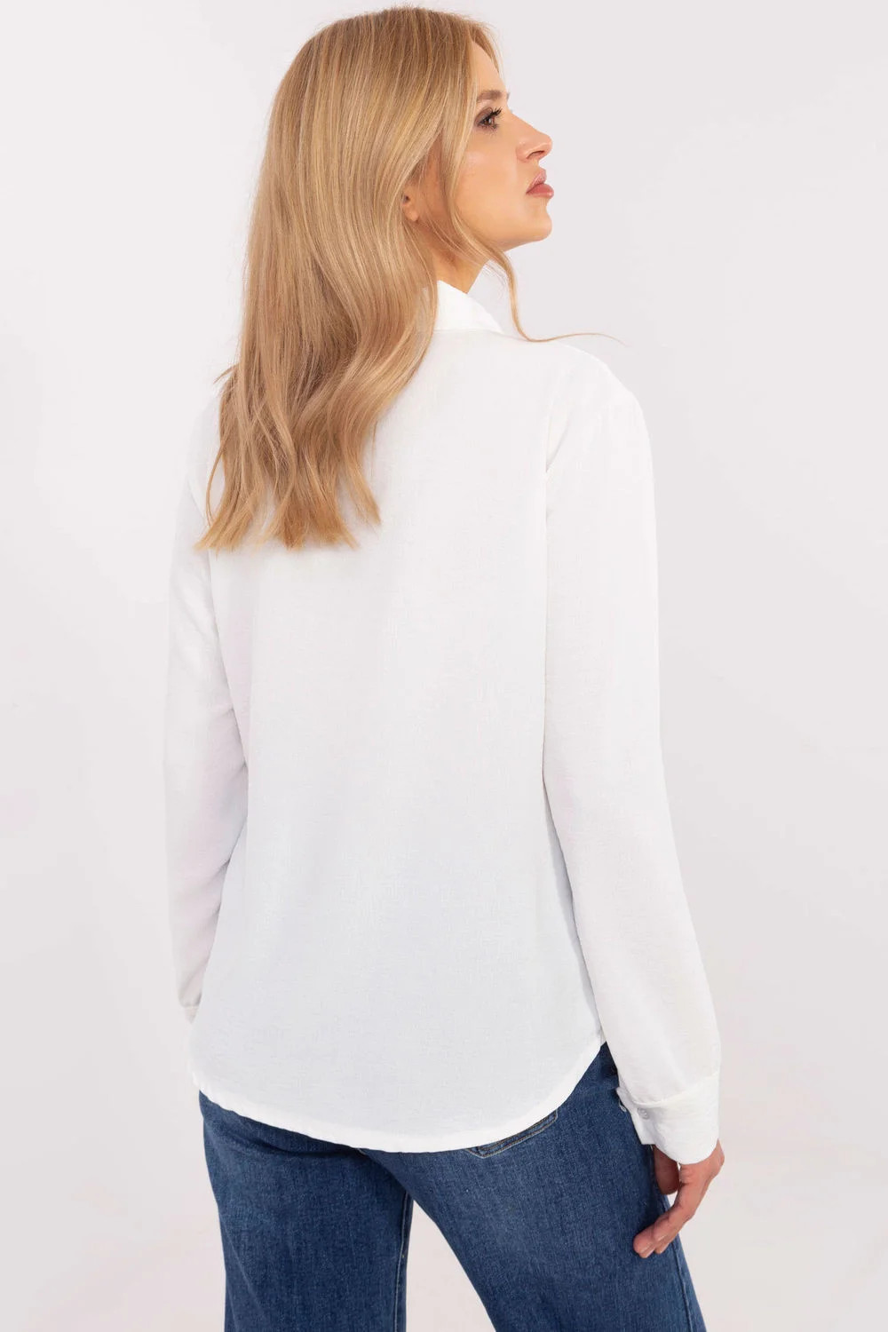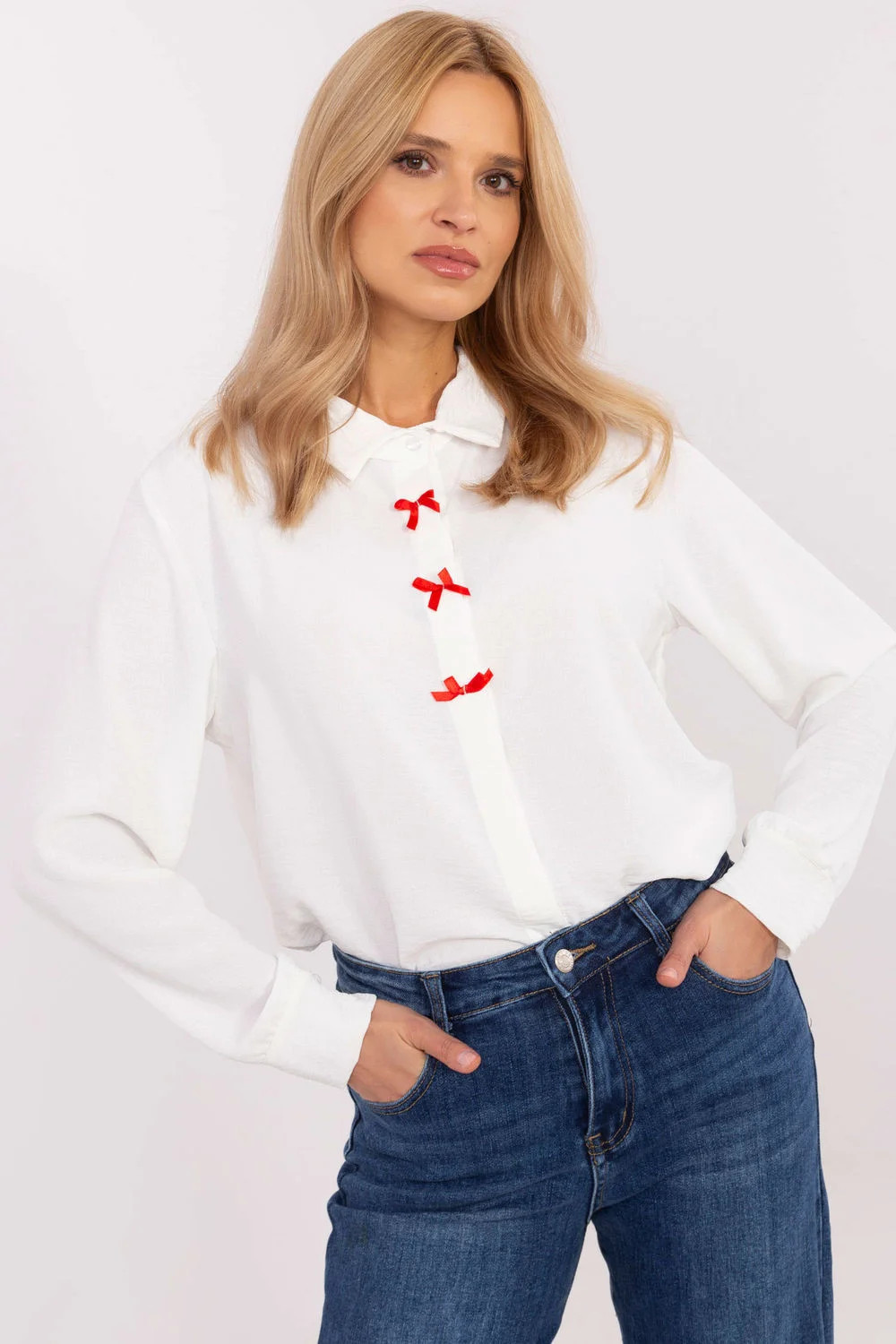 Elegantní dámská košile je výjimečnou volbou pro ženy, které ocení klasický styl s jemným dekorativním prvkem. Vyrobená z hladké směsi polyesteru a elastanu, košile poskytuje pohodlí při nošení, odolnost a skvělé padnutí. Standardní délka a klasický límeček zdůrazňují univerzální charakter modelu. Zapíná se na knoflíky skryté pod proužkem, košile vypadá mimořádně uhlazeně a stylově. Ozdobné mašličky na přední části, umístěné podél řady knoflíků, jí dodávají rafinovaného šarmu, skvěle zapadajícího do elegantních stylizací. Dlouhé rukávy s manžetami dokreslují elegantní vzhled. Jedná se o skvělou volbu na společenské události, do práce nebo večerní vycházky. Košile skvěle ladí s elegantními kalhotami, sukněmi nebo oblekem, nabízející mnoho možností vytvoření výjimečných stylizací, které spojují eleganci s nádechem originality.