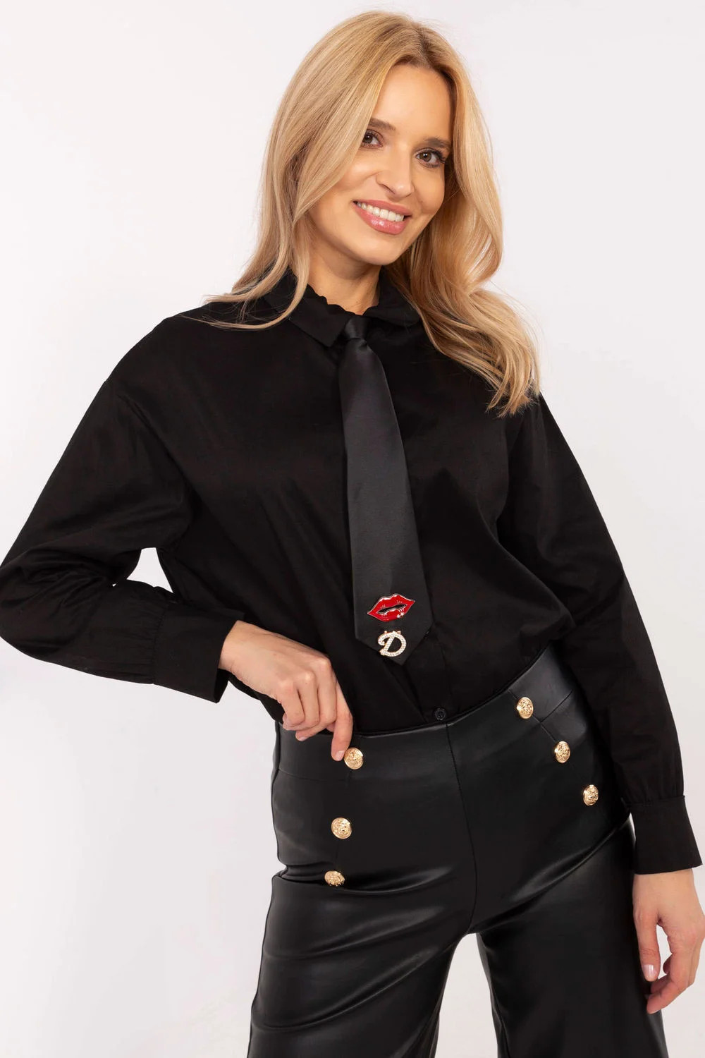 Klasická dámská košile s volným střihem, skvělá na každý den. Vyrobena z kombinace bavlny a elastanu, poskytuje pohodlí a skvělé přizpůsobení postavě. Hladký materiál dělá z košile všestrannou základnu pro různé styly. Model má klasický límec a zapínání na knoflíky, co mu dodává nadčasový charakter. Standardní délka a dlouhý rukáv dělají z košile praktickou volbu na každé roční období. Speciální prvky, jako je odnímatelná kravata a odnímatelná brož, umožňují personalizaci a přizpůsobení košile různým příležitostem. Přidejte kravatu a brož, abyste zdůraznili originální styl, nebo je sundejte pro volnější vzhled. Ideální pro ženy, které oceňují klasickou eleganci s ležérním akcentem.