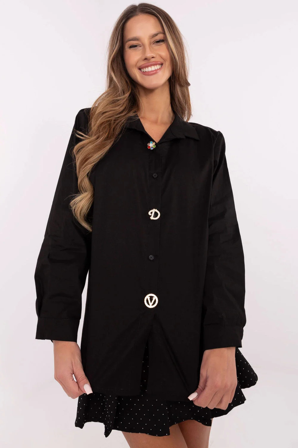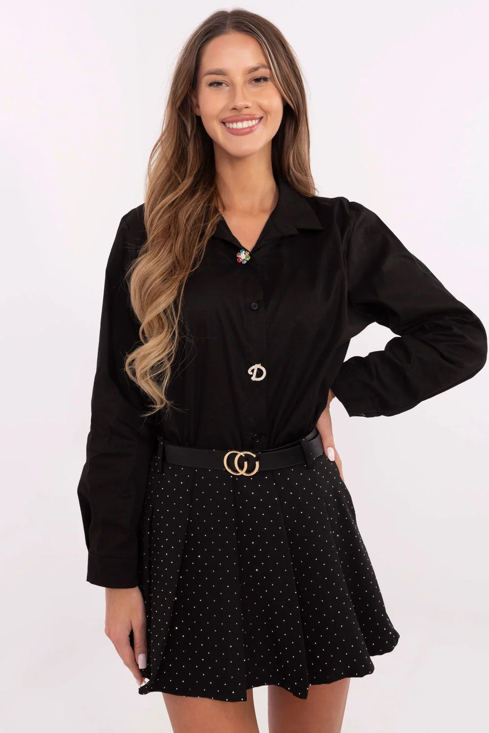 Elegantní dámská košile s klasickým střihem, ideální na formální události, do práce, na každý den nebo na večírek. Vyrobená z vysoce kvalitní směsi bavlny a elastanu, zaručuje pohodlí a skvělé přizpůsobení postavě. Košile má standardní délku a dlouhý rukáv, čímž je univerzální volbou na každé roční období. Klasický límec a zapínání na knoflíky zdůrazňují její nadčasový charakter. Výjimečným prvkem jsou odnímatelné brože, které umožňují personalizaci outfitu. Přidejte brože, abyste košili dodali výraz na speciální události, nebo je sundejte pro minimalistický, klasický vzhled. Hladký materiál a elegantní styl zaručují, že se košile hodí jak k formálním, tak poloformálním outfitům. Je to skvělá volba pro ženy, které oceňují klasiku a všestrannost ve svém šatníku.