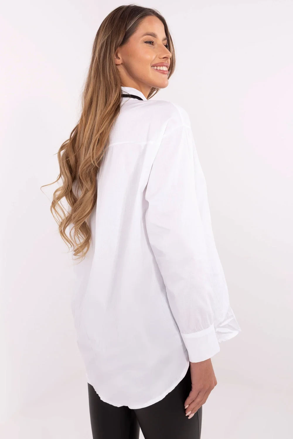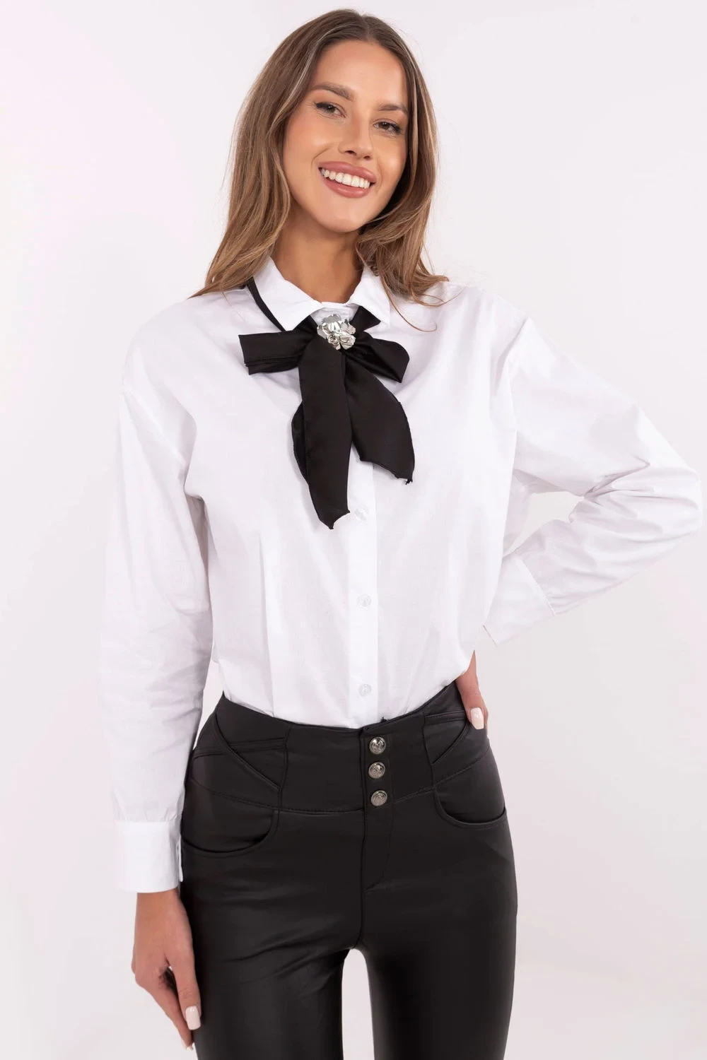 Klasická dámská košile je kvintesencí elegance a funkčnosti, skvělá na každý den, do práce nebo na společenské události. Vyrobená z vysoce kvalitní bavlny, poskytuje pohodlí přes den a skvěle se přizpůsobuje postavě. Hladká tkanina zdůrazňuje její univerzální charakter, čímž se stává nezbytnou součástí každého šatníku. Model s standardní délkou, dlouhými rukávy a klasickým límečkem se vyznačuje doplňky, které dávají košili výjimečný styl. Přiložená brož a šála, které lze sundat, umožňují personalizaci stylizace od minimalistické klasiky po více ozdobný, módní vzhled. Zapíná se na knoflíky a skvěle ladí jak s elegantními kalhotami, tak s sukněmi, nabízí mnoho možností stylizace. Je to skvělá volba pro ženy, které ocení nadčasový styl s nádechem moderních detailů.