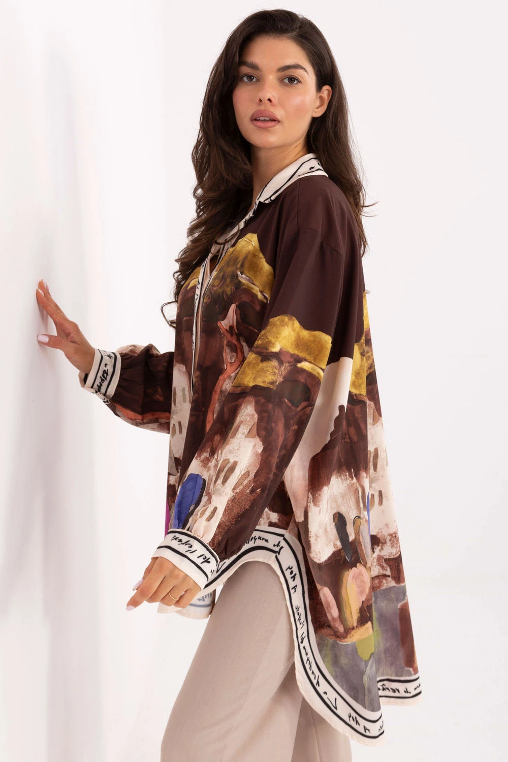 Košile pro ženy v casual stylu, ideální na každý den i do práce. Vyrobená z lehké a příjemné směsi viskózy a polyesteru, zaručuje pohodlné nošení po celý den. Model s delším střihem s klasickým límcem a dlouhými rukávy zapínající se na knoflíky, skryté pod elegantní lištou. Na celém materiálu je potisk a další detaily ve formě nápisů na límci, liště a kolem spodního okraje dodávají košili moderní, originální charakter. Jedná se o nabídku pro ženy, které oceňují pohodlí spojené s originálním stylem.