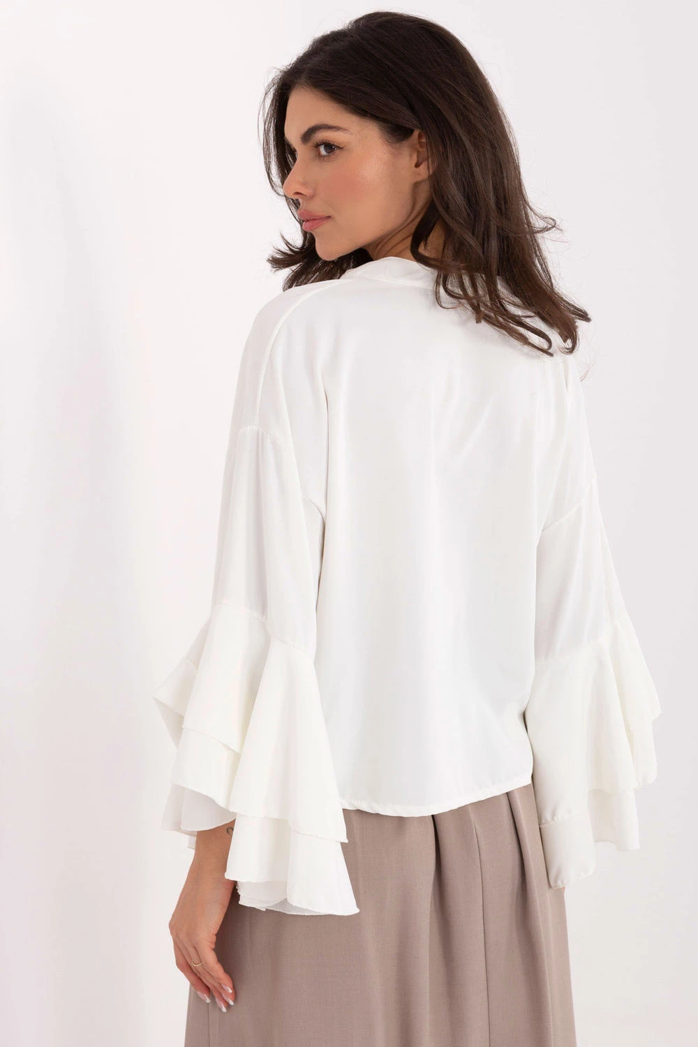 Elegantní dámská košile s elegantním a zároveň moderním charakterem. Ideální na každý den, do práce a na společenské události. Vyrobená z lehkého, příjemného polyesteru s elastanem, který skvěle padne a poskytuje pohodlí po celý den. Model se vyznačuje hladkou látkou a kratším střihem, který zdůrazňuje ženskou siluetu. Místo tradičního límce má košile elegantní stojáček a klasické zapínání na knoflíky jí dodává nadčasový styl. Dlouhé rukávy jsou zakončeny jemnými volány, které dodávají celku lehkost a jemný romantismus. Na hrudi je praktická kapsa, která zároveň představuje stylový doplněk. Skvělá volba pro ženy, které ocení eleganci v každodenním provedení, skvěle se hodí jak do kanceláře, tak i na setkání nebo výstupy v formálnějším tónu.