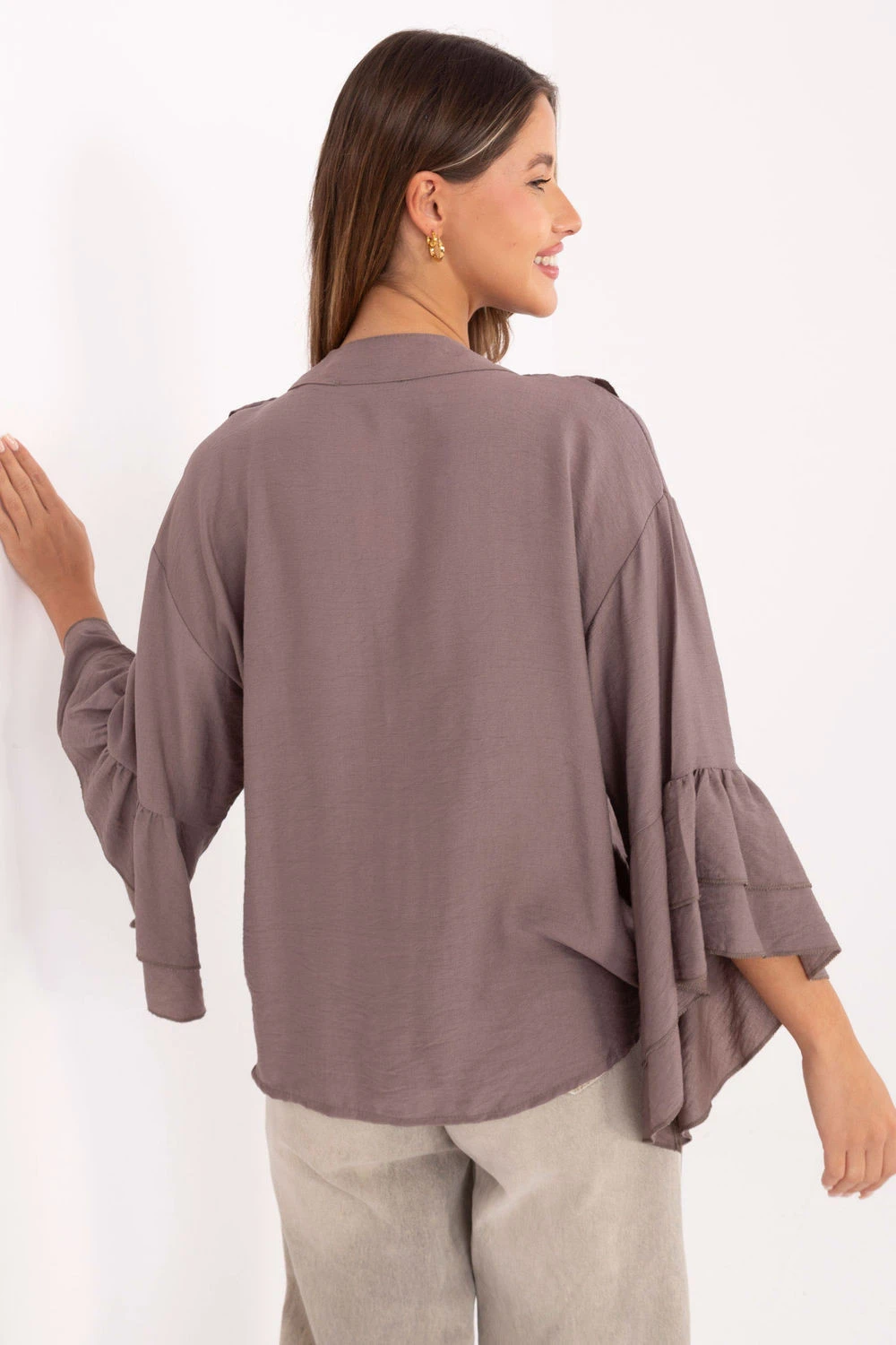 Elegantní dámská košile bez límce, vyrobená z vysoké kvality viskózy, je skvělou volbou jak do každodenního života, tak do práce nebo na slavnostní příležitosti. Klasický střih s standardní délkou zdůrazňuje postavu, zároveň poskytuje pohodlí a volnost pohybu. Model se vyznačuje dlouhým rukávem zakončeným volánky od poloviny délky, co dodává celku decentní a ženský charakter. Na přední straně je umístěn ozdobný rouch, který košili dodává eleganci a originalitu. Kulatý výstřih a zapínání na knoflíky zdůrazňují klasický a zároveň moderní styl. Hladký materiál s elegantním zpracováním dělá z košile skvělý kousek na nošení jak s látkovými kalhotami, tak s sukní. Jedná se o univerzální kousek šatníku, ideální pro ženy, které ocení klasiku s nádechem rafinovaného stylu.