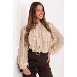 Elegantní a ženská dámská košile, která se skvěle hodí jak na každodenní nošení do práce, tak i na speciální příležitosti. Vyrobená z vysoce kvalitní směsi polyesteru a elastanu, je lehká, elastická a příjemná na dotek, což zaručuje pohodlí po celý den. Model má klasický límec a zapínání na knoflíky, což mu dodává elegantní a nadčasový charakter. Pozornost přitahuje plisovaný límec s mašlí na přední straně, který představuje efektní ženský akcent. Dlouhé, plisované rukávy jemně oživují celkový vzhled a dodávají košili mimořádnou eleganci. Díky hladkému materiálu a standardní délce se košile skvěle hodí jak k sukni, tak i k kalhotám, vytvářející stylový outfit do kanceláře nebo na speciální události.