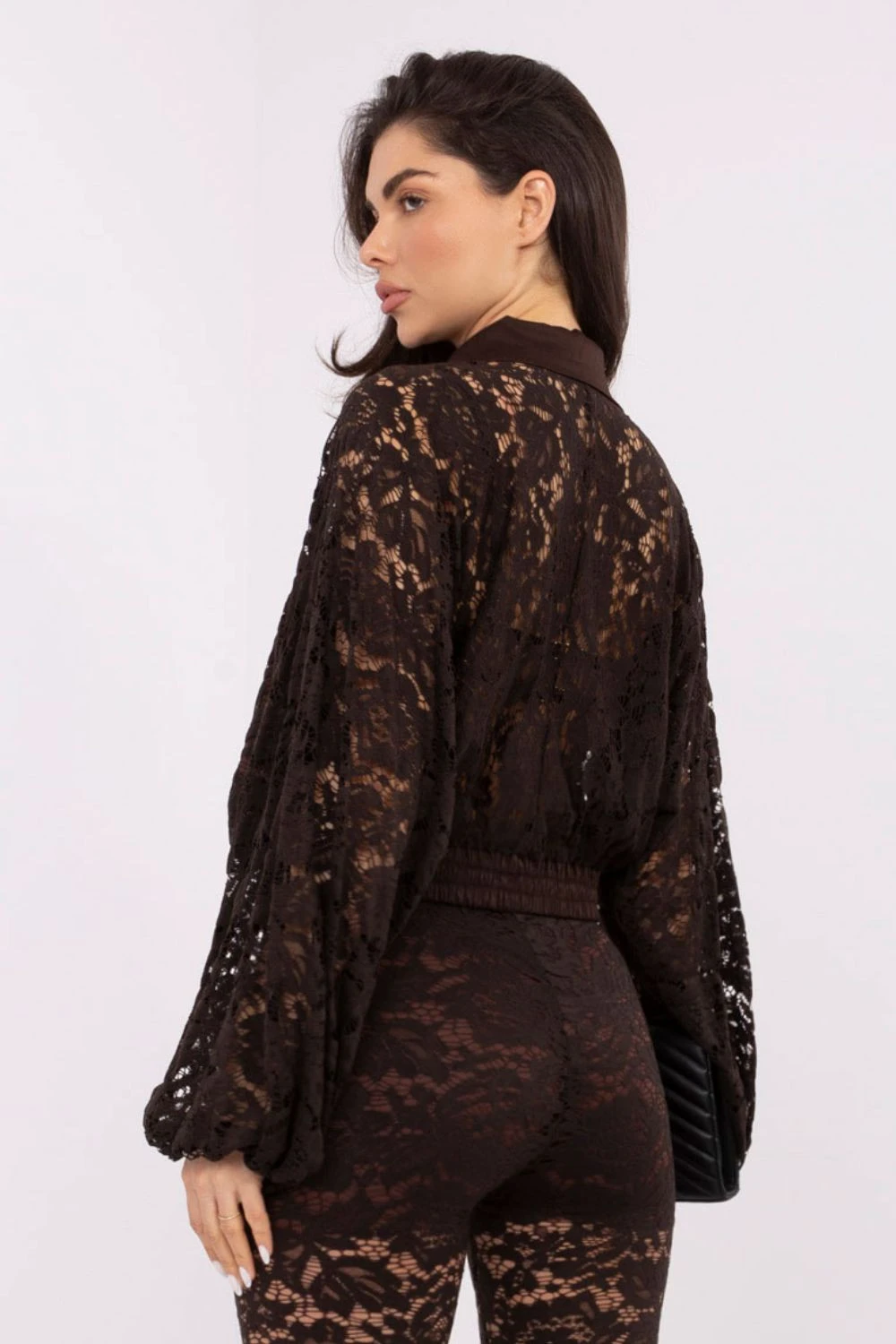 Elegantní dámská košile vyrobená z jemné krajky je stylovým návrhem ideálním na každý den, do práce, na večerní vycházky a večírky. Dírkovaný vzor jí dodává výjimečný ženský charakter a kombinace polyesteru, viskózy a elastanu zajišťuje pohodlí nošení a jemnou elasticitu materiálu. Model má klasický límec a dlouhý, objemný rukáv, který celku dodává moderní, efektní vzhled. Košile se zapíná na knoflíky a na spodním okraji je pohodlně ukončena pružným lemem, díky čemuž se skvěle tvaruje podle postavy. Přední část košile je vybavena podšívkou, co zvyšuje pohodlí a umožňuje zachovat elegantní efekt přes krajkovou strukturu. Kratší délka jí dodává moderní charakter a činí ji ideálním prvkem mnoha outfitů, jak elegantních, tak více večírkových.