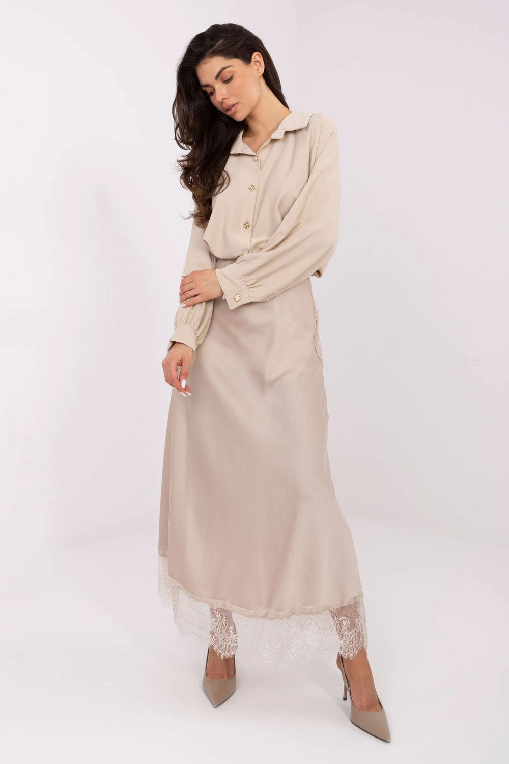 Klasická dámská košile v elegantním stylu je ideální volbou na každý den, do práce a na společenské události. Její hladký vzor zdůrazňuje nadčasový charakter a pečlivé provedení zajišťuje skvělý vzhled v mnoha různých stylizacích. Model je vyroben z lehkého, příjemného polyesteru, který se dobře přizpůsobuje postavě. Prodloužený střih a jemné rozparky po stranách dodávají košili moderní vzhled a zajišťují volnost pohybu. Košile má dlouhý rukáv zakončený jemným manžetou a nafouklé rukávy, které dodávají celku módní a výrazný akcent. Klasický límec a zapínání na knoflíky zdůrazňují elegantní charakter modelu. Jedná se o stylovou a funkční košili, ideální pro ženy, které ocení spojení klasiky s moderními detaily.