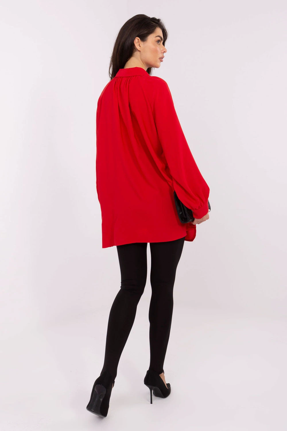Klasická dámská košile v elegantním stylu je ideální volbou na každý den, do práce i na slavnostní příležitosti. Její hladký vzor podtrhuje nadčasový charakter a pečlivé provedení zaručuje, že se skvěle hodí do mnoha různých stylizací. Model je vyroben z lehkého, příjemného na dotek polyesteru, který se dobře přizpůsobuje siluetě. Prodloužený střih a subtilní rozparky po stranách dodávají košili moderní vzhled a zajišťují volnost pohybu. Košile má dlouhý rukáv zakončený jemným manžetou a nadýchané rukávy, které přidávají celku módní, výrazný akcent. Klasický límec a zapínání na knoflíky zdůrazňují elegantní charakter modelu. Jedná se o stylovou a funkční košili, ideální pro ženy, které oceňují kombinaci klasiky s moderními detaily.