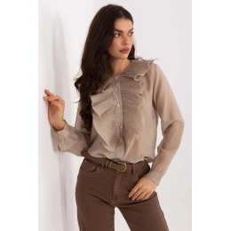 Elegantní klasická dámská košile, ideální na každý den, do práce a na formální události. Vyrobená z vysoce kvalitní směsi lyocellu a polyesteru, co zajišťuje měkkost, lehkost a pohodlí nošení, zároveň dodává košili elegantní a klasický vzhled. Model standardní délky je zdoben hladkým vzorem, který podtrhuje její nadčasový styl. Kulatý výstřih decentně vystavuje krk, přední část zdobí volánek spojený s límečkem vyrobeným ze stejného materiálu jako volánek, co dodává košili výjimečnou jemnost a eleganci. Košile má dlouhé rukávy s manžetou a zapínání na knoflíky, co zdůrazňuje její klasický charakter a usnadňuje sladění s outfit. Toto je nabídka pro ženy, které oceňují eleganci spojenou s pohodlím a decentní dekorativní detaily v každodenním i formálním oblečení.