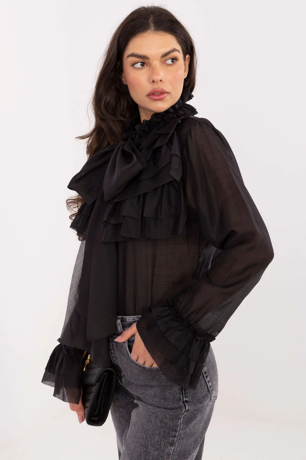 Elegantní dámská košile se stojáčkem, klasický model ideální na každý den, do práce a na slavnostní příležitosti. Vyrobená z vysoce kvalitní směsi tencelu a polyesteru, což zaručuje měkkost, lehkost a pohodlí nošení, a zároveň elegantní, pečlivý vzhled. Model s standardní délkou se vyznačuje hladkým vzorem, který zdůrazňuje její nadčasový charakter. Dlouhé rukávy se zakončením volánem dodávají celku jemnou ženskost a jemnost, a stojka opticky prodlužuje postavu a zdůrazňuje krk. Na přední straně košile je ozdobný límeček s mašlí, který představuje elegantní detail, dodávající šarm a výjimečný charakter. Košile má také zapínání na knoflíky, což usnadňuje její přizpůsobení a zachovává klasický střih. Jedná se o skvělý návrh pro ženy, které oceňují kombinaci elegance, pohodlí a jemných detailů v každodenních i slavnostních stylizacích.