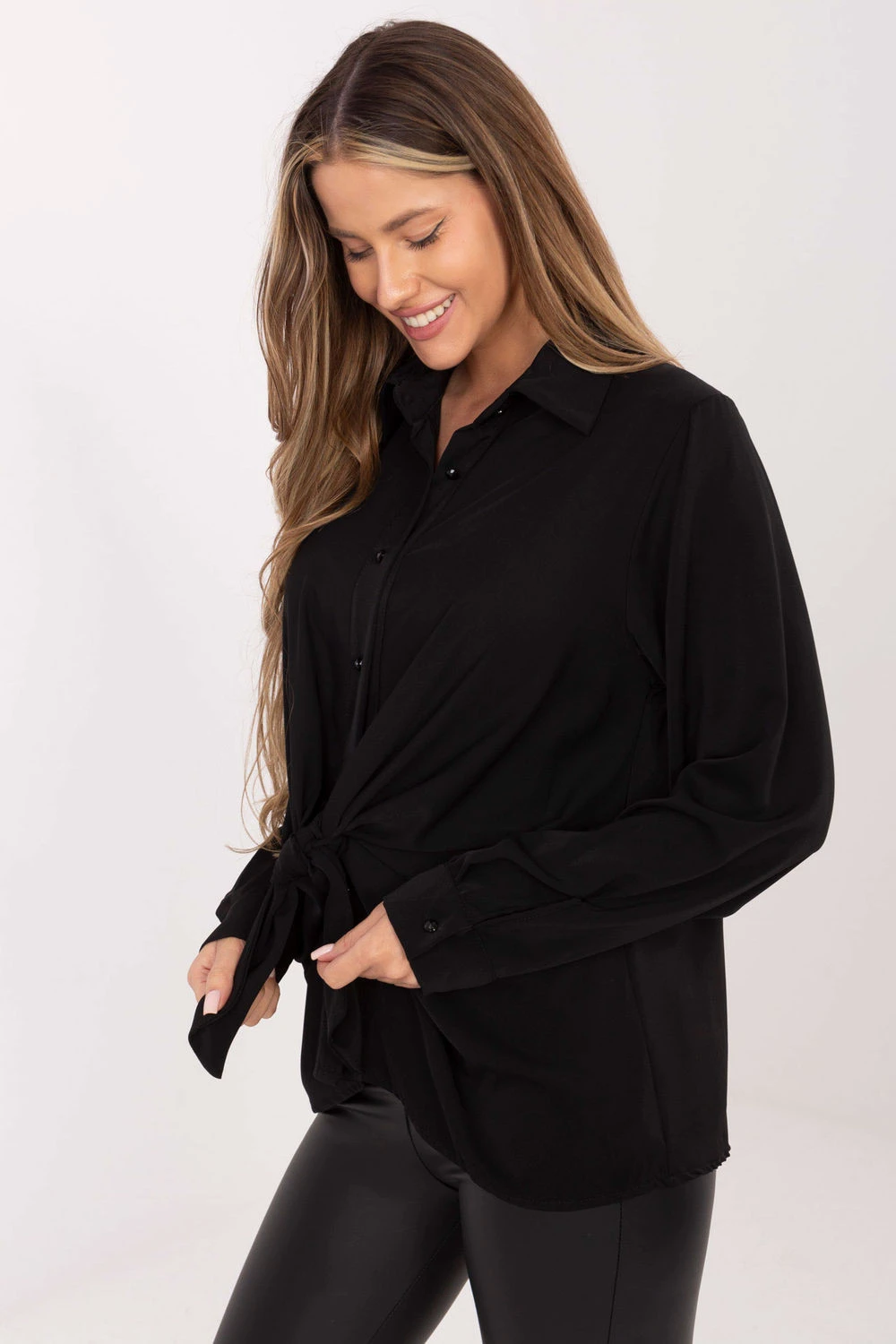 Elegantní klasická dámská košile, ideální na každý den, do práce a na různé společenské události. Vyrobená z vysoce kvalitního polyesteru, díky čemuž je lehká, odolná a pohodlná na nošení a zároveň si udržuje bezchybný vzhled po celý den. Model s standardní, delší délkou má hladký, nadčasový vzor, který dělá košili skvěle sladěnou jak s elegantními kalhotami, tak s klasickou sukní. Límeček jí dodává formální charakter a zdůrazňuje klasický styl. Košile má dlouhý nafouklý rukáv s manžetou, která dodává celku jemnou ženskost a módní akcent. Na přední straně je ozdobné vázání, které má dekorativní funkci, přitahuje pohled a dodává celku jedinečný výraz. Model se zapíná na knoflíky, což zdůrazňuje jeho elegantní, tradiční charakter. Je to nabídka pro ženy, které ocení styl, pohodlí a jemné ozdobné detaily, které dělají klasickou košili výjimečnou v každodenních i oficiálních stylizacích.
