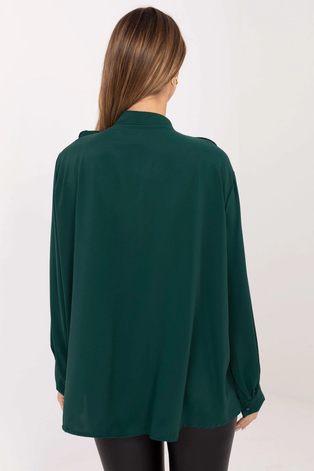 Tato elegantní dámská košile s klasickým střihem okouzluje výjimečným detailem širokým, plisovaným žabotem umístěným na přední straně, který jí dodává stylový a návštěvní charakter. Vyrobena z hladkého polyesteru, působí bezchybně a skvěle se hodí jak na každý den, tak do práce nebo na formální události. Model s standardní délkou má dlouhý, nafouklý rukáv, který dodává jemnou lehkost a ženský šarm. Výstřih s vázáním vytváří efektní zakončení a klasické zapínání na knoflíky zdůrazňuje nadčasový styl košile. Je to ideální volba pro ženy, které ocení eleganci v moderním provedení.