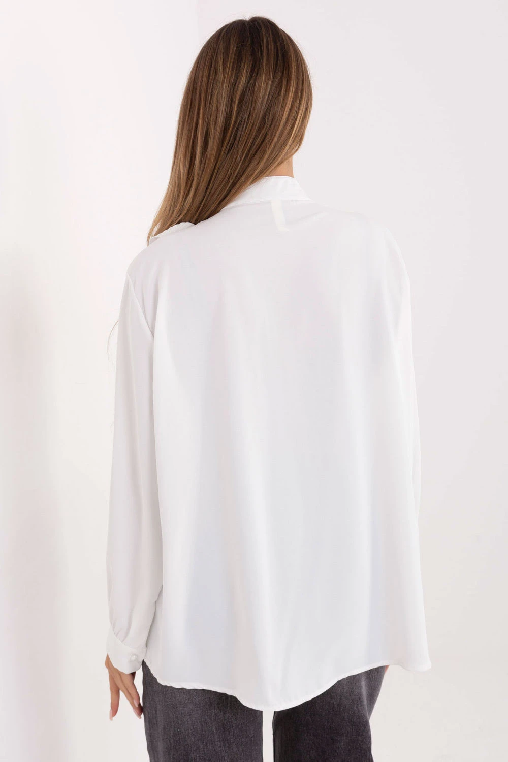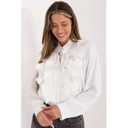 Tato elegantní dámská košile klasického střihu okouzluje neobvyklým detailem širokého, plisovaného jabotu umístěného vpředu, který jí dodává elegantní a návštěvní charakter. Vyrobena z hladkého polyesteru vypadá bezchybně a skvěle se hodí jak na každý den, tak do práce nebo na formální události. Model standardní délky má dlouhý, nadýchaný rukáv, který dodává jemnou lehkost a ženský půvab. Výstřih s vázáním vytváří efektní zakončení, a klasické zapínání na knoflíky zdůrazňuje nadčasový styl košile. Je to ideální volba pro ženy, které si cení eleganci v moderním provedení.