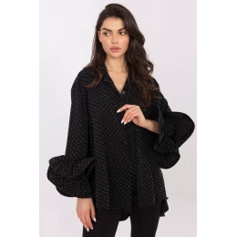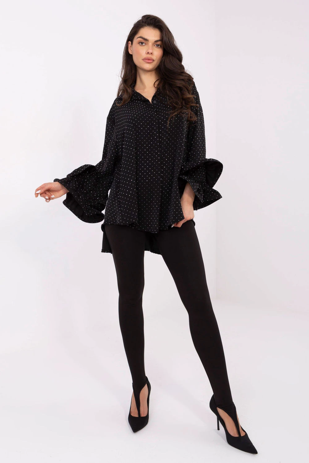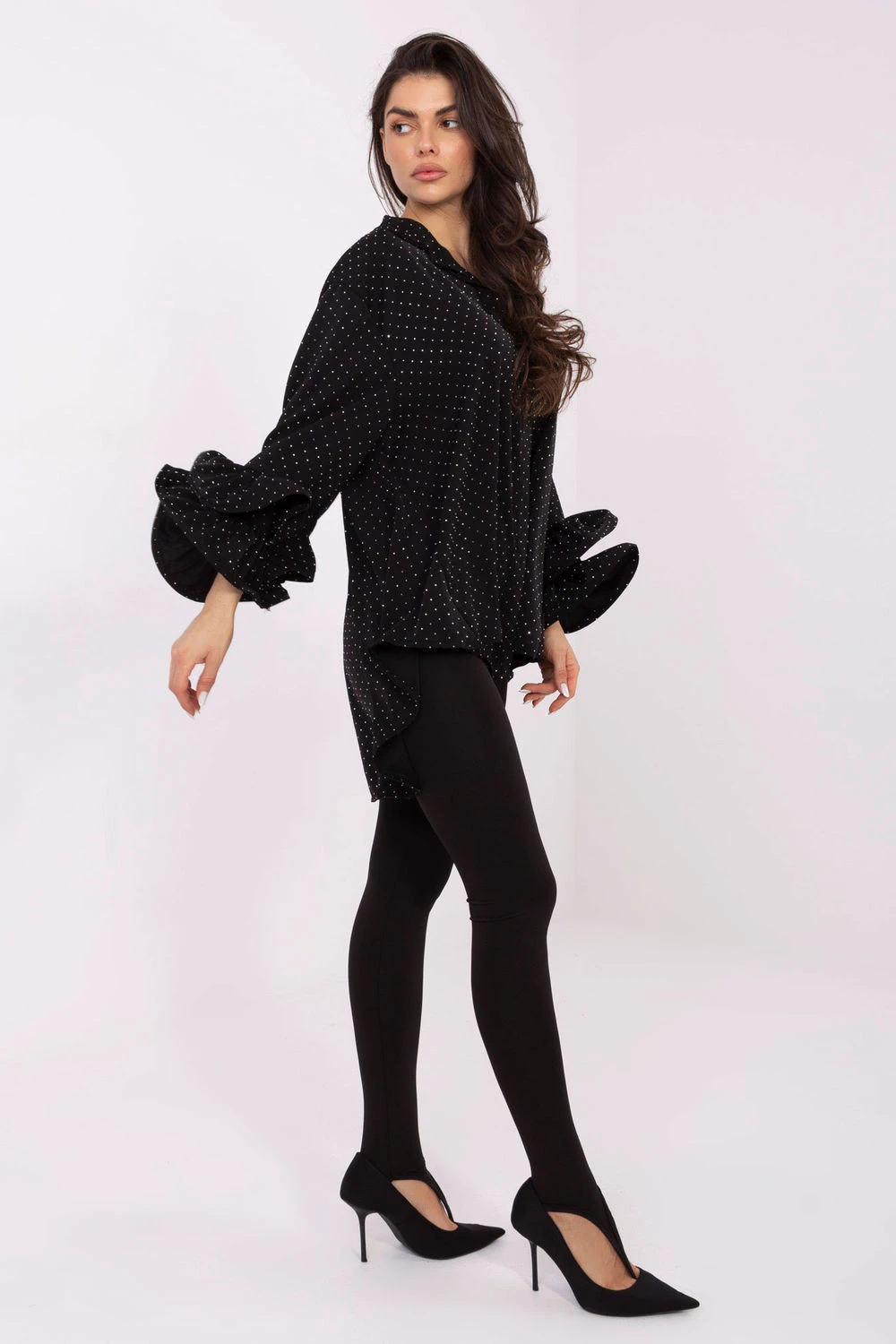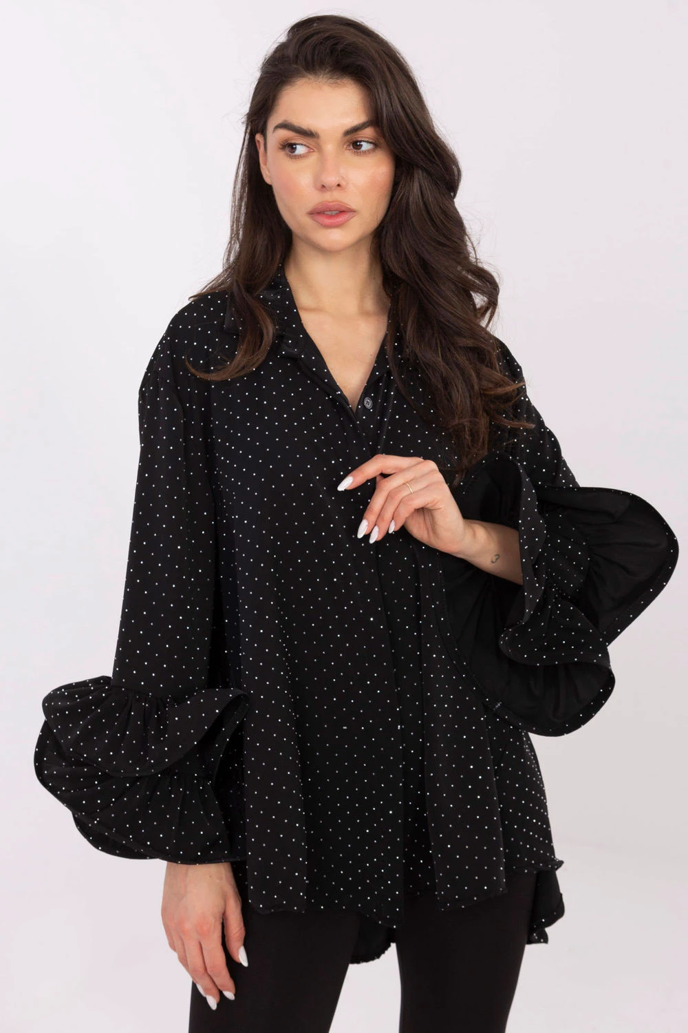 Elegantní dámská košile s prodlouženým zády je unikátní model, který spojuje klasický střih s rafinovaným, párty charakterem. Navržená v elegantním stylu se skvěle hodí na návštěvy, slavnostní události, bankety, ale také na večerní vycházky a párty. Celou plochu košile zdobí aplikace z jete, vytvářející efektní, lesklý vzor, který dodává celku luxusní výraz. Dlouhý střih s prodlouženým zády jemně zeštíhluje postavu a působí velmi stylově. Vyrobena ze směsi bavlny, elastanu a polyesteru, košile je zároveň pohodlná, elastická a odolná proti mačkání. Dlouhý rukáv zakončený volány přináší ženský a lehce romantický akcent, zatímco klasický límec zdůrazňuje výjimečný charakter modelu. Košile se zapíná na knoflíky, což umožňuje přizpůsobit hloubku výstřihu a usnadňuje oblékání. Ideální volba pro ženy, které ocení eleganci, ale také zář a moderní dokončení. Skvělá na speciální příležitosti a stylové vycházky.
