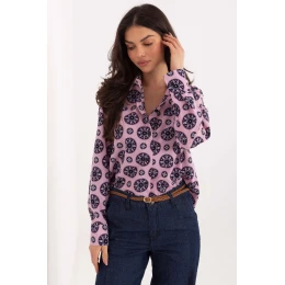 Elegantní dámská košile s klasickým střihem, ideální pro každodenní outfit i do práce. Model standardní délky s jemně prodlouženým zadním dílem vypadá moderně a skvěle padne na postavě, poskytující pohodlí během celého dne. Košile je vyrobena z kombinace polyesteru a elastanu, díky čemuž je elastická, odolná a odolná proti mačkání. Barevný potisk jí dodává výrazný, stylový charakter, který oživuje elegantní formu a umožňuje vyniknout v kancelářských a každodenních outfitech. Klasický límec a zapínání na knoflíky s potahem zdůrazňují uklizený, elegantní vzhled košile. Dlouhý rukáv z ní dělá skvělý model na celý rok. Jedná se o univerzální návrh, který skvěle ladí jak s elegantními kalhotami a sukní, tak i s džíny.
