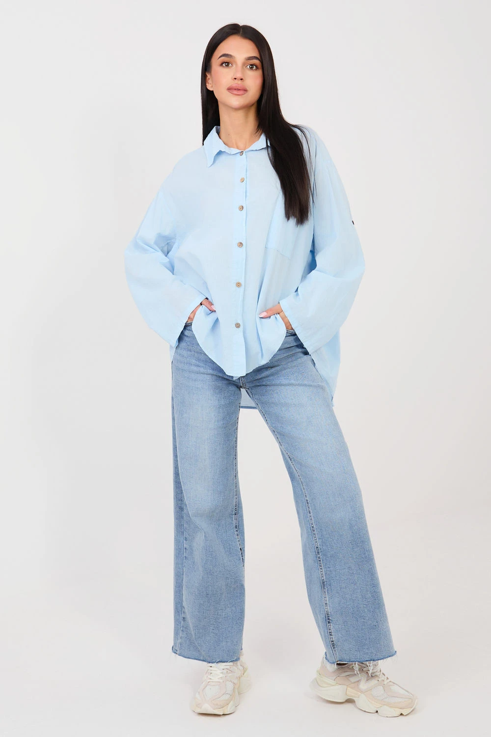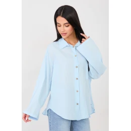 Dámská košile Casual s klasickým, každodenním charakterem, kombinující pohodlí s decentními detaily. Vyrobená z měkké bavlny, poskytuje pohodlí a volnost pohybu. Model s hladkým vzorem má dlouhý rukáv s možností zkrácení, co umožňuje přizpůsobit košili počasí a stylizaci. Elegantní límec a zapínání na knoflíky vpředu dodávají košili nadčasový vzhled, a praktická kapsa na hrudi zdůrazňuje casual styl. Zadní část košile je zdobená ozdobnou záložkou, dodávající celkovému vzhledu lehkost a decentní charakter. Standardní délka dělá košili skvěle kombinovatelnou jak s džíny, tak s sukněmi, vytvářející univerzální každodenní stylizaci.