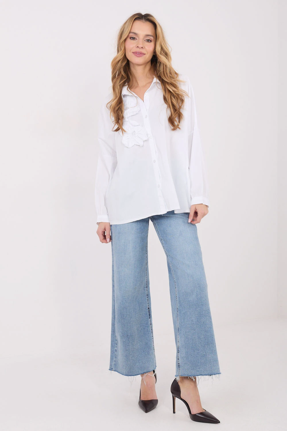 Košile pro ženy s knoflíky, která kombinuje pohodlí s ženským, dekorativním akcentem. Vyrobená z měkké bavlny s přídavkem elastanu, poskytuje pohodlí a volnost pohybu. Model standardní délky má klasický límec a dlouhé, lehce objemné rukávy, které dodávají celku moderní a jemně romantický charakter. Hladký základ košile oživuje aplikace v podobě přišitých květů, které jsou efektním detail a zdůrazňují neformální styl. Ideální volba pro každodenní outfit, jak s džínami, tak s sukní.