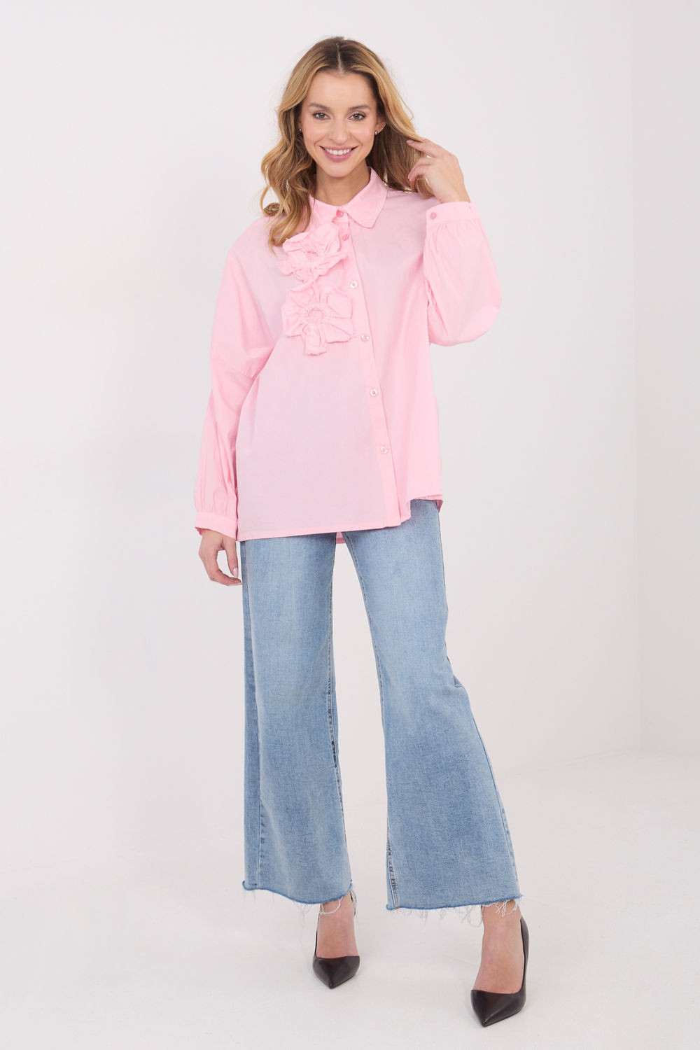Košile pro ženy s casual střihem zapínána na knoflíky, která spojuje pohodlí s ženským, dekorativním akcentem. Vyrobená z měkké bavlny s přídavkem elastanu, poskytuje pohodlí při nošení a volnost pohybu. Model standardní délky má klasický límec a dlouhé, lehce objemné rukávy, které dávají celku moderní a jemně romantický charakter. Hladkou základnu košile oživuje aplikace ve formě přišitých květů, která je efektním detail a zdůrazňuje casual styl. Ideální volba pro každodenní outfit, jak s džíny, tak s sukní.