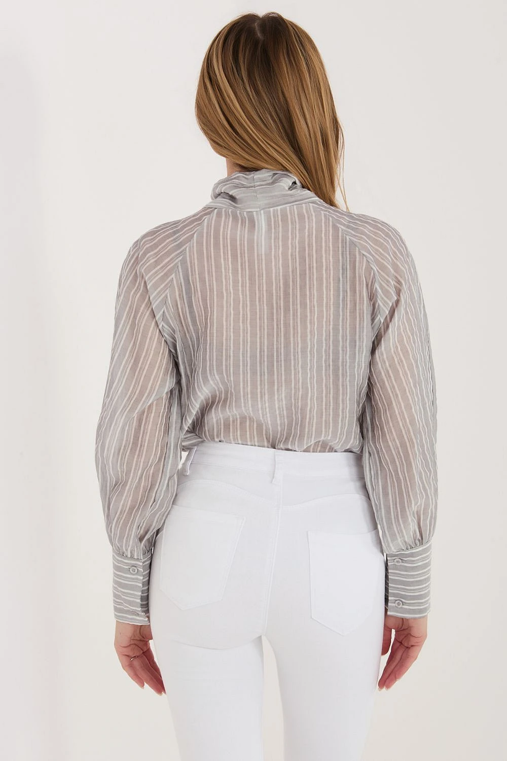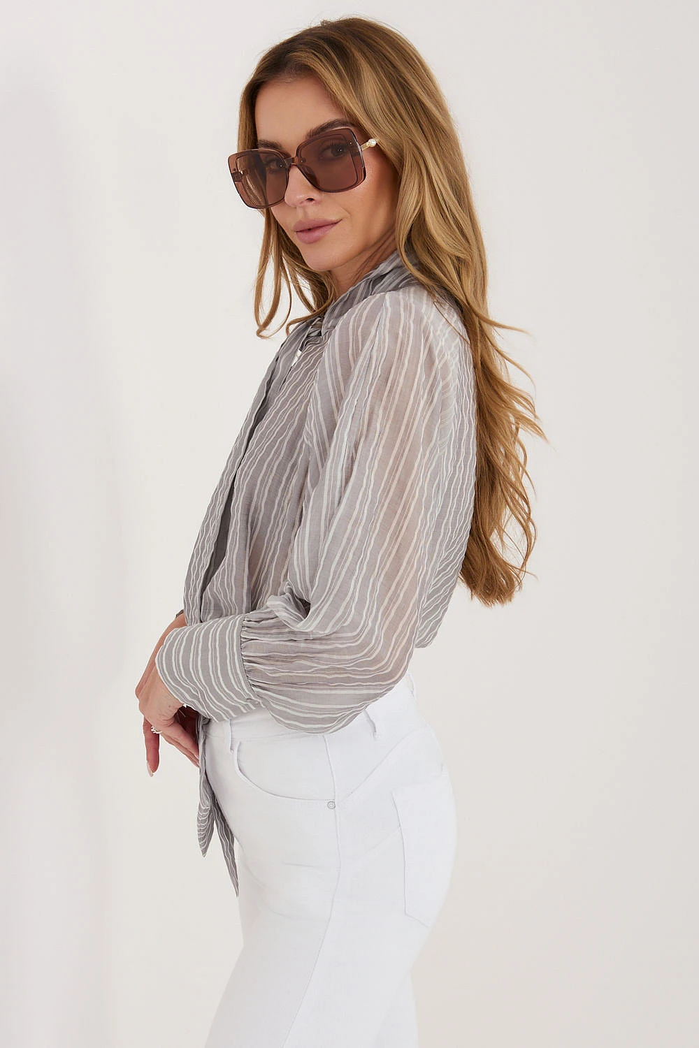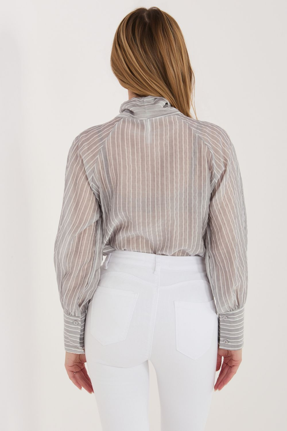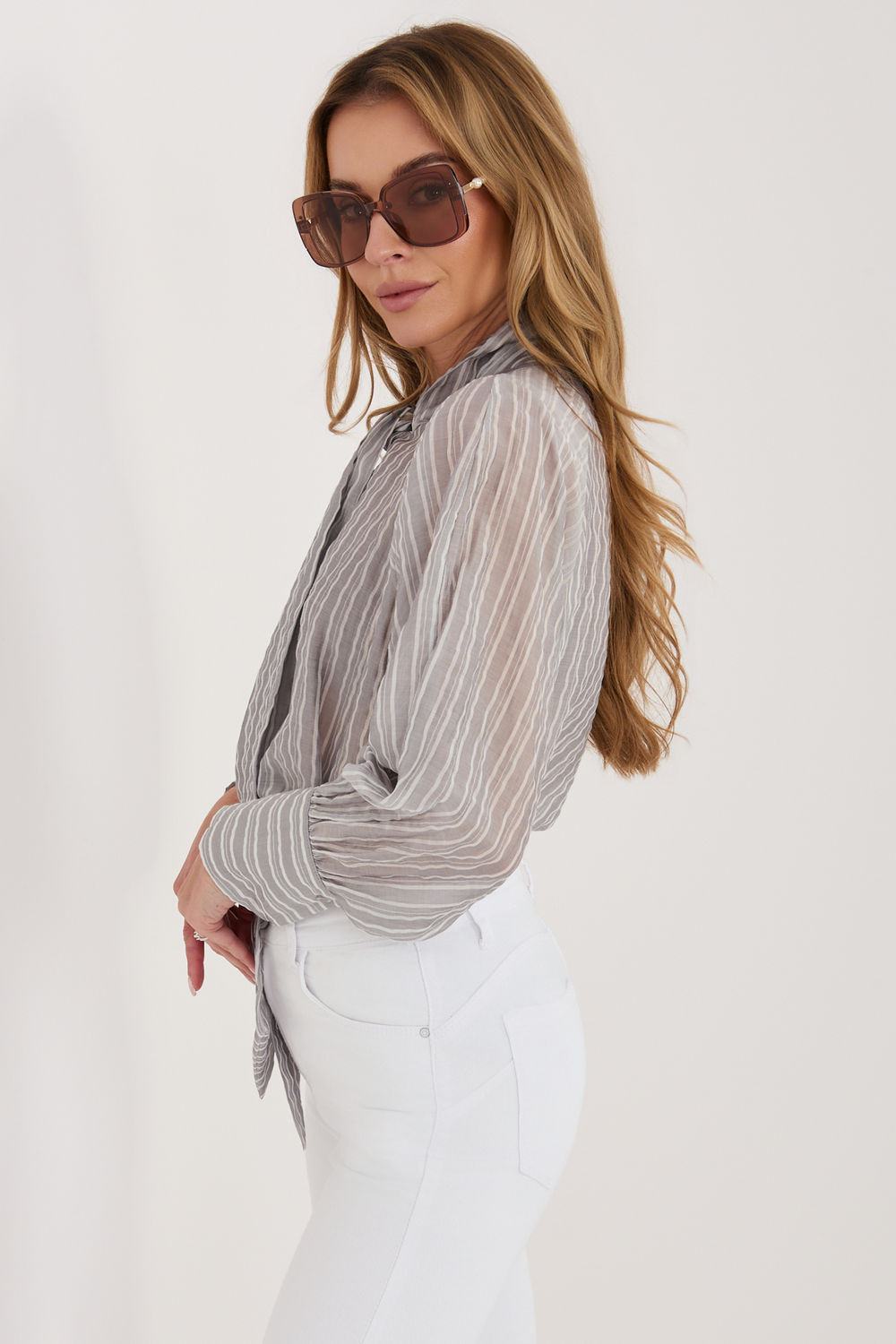 Košile ženská klasického střihu, která se skvěle hodí jak na každodenní nošení do práce, tak i na více formální události. Model standardní délky s knoflíky kombinuje nadčasovou eleganci s moderními detaily. Vyrobená z příjemné směsi lyocellu a polyesteru poskytuje pohodlí a odolnost. Tkanina je zdobená jemným vzorem drobných pruhů, který dodává celku lehkost a stylový charakter. Košile se vyznačuje nafouklými rukávy zakončenými širokými manžetami, které dodávají siluetě výraznosti. Další výhodou je šněrování na krku, které umožňuje vytvoření elegantní mašle nebo volného uvázání podle příležitosti.