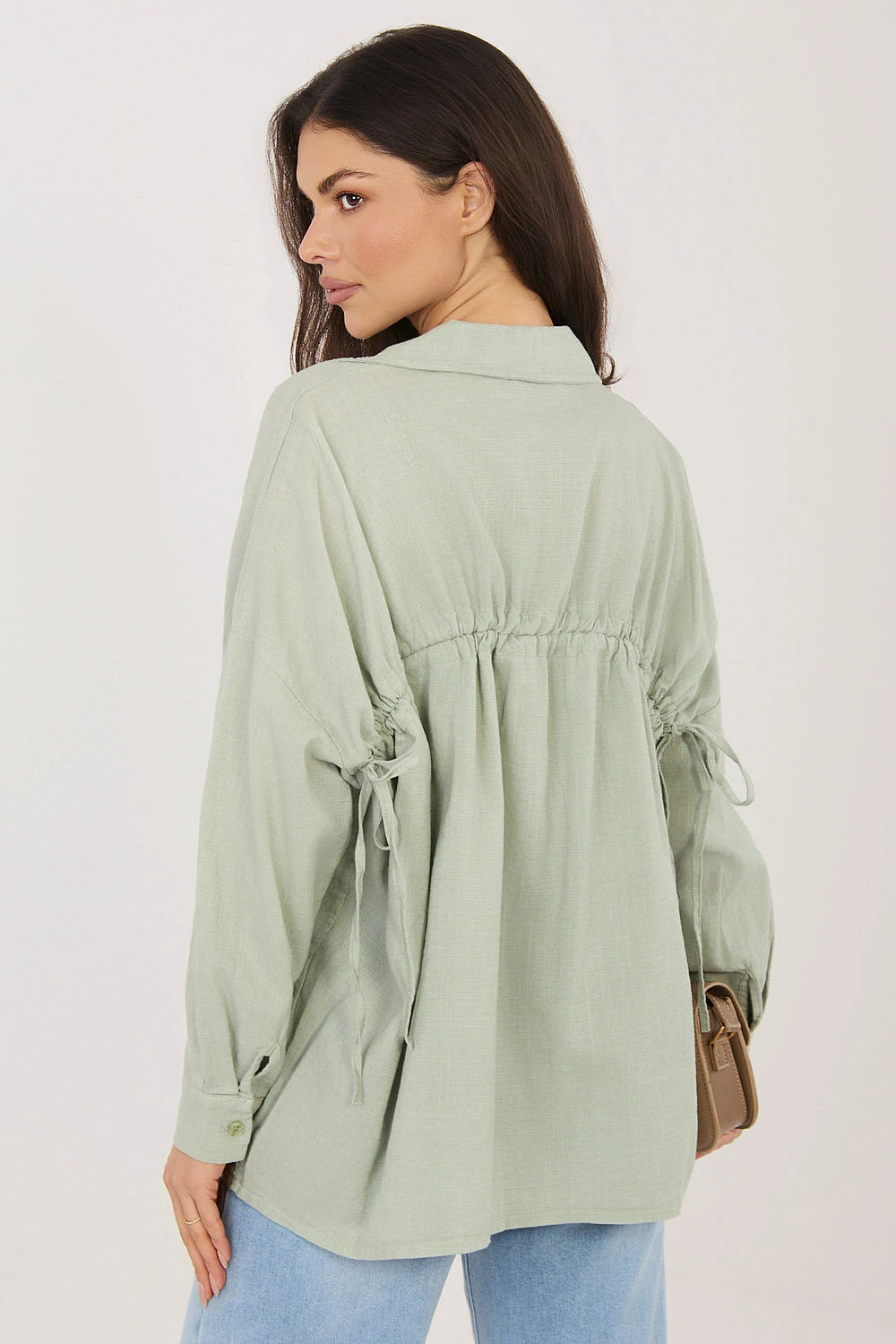 Dámská košile v casual stylu, která se skvěle hodí jak do každodenních outfitů, tak do práce. Klasický, hladký vzor dělá z modelu univerzální kousek, který lze snadno kombinovat s různými kousky oblečení, od elegantních kalhot až po džíny. Košile je vyrobena z vysoce kvalitní směsi lyocellu, bavlny a lnu, díky čemuž je materiál lehký, prodyšný a příjemný na nošení. Standardní délka umožňuje nosit ji jak zasunutou do kalhot nebo sukni, tak volně. Model má klasický límec a dlouhé rukávy, které zdůrazňují nadčasový charakter košile. Další výhodou je praktické šněrování na zádech, které umožňuje upravit šířku košile a lépe ji přizpůsobit postavě, přičemž celkově dodává subtilní, ženský akcent.