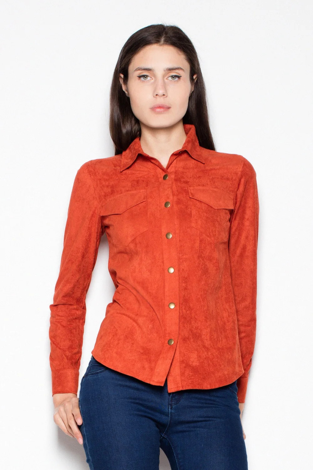 Semišová košile s dlouhými rukávy a kovovými knoflíky. Model klasického střihu se skvěle hodí k přiléhavým kalhotám.