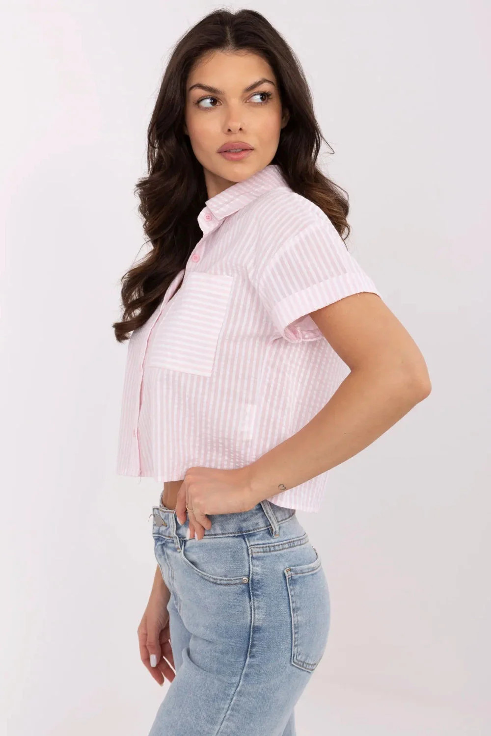 Dámská košile v proužcích je ideální volbou na každý den. Vyrobená z prodyšné, příjemné bavlny, poskytuje pohodlí po celý den. Krátká délka a krátký rukáv z ní dělají skvělý kousek na teplejší dny. Klasický límeček a zapínání na knoflíky jí dodávají univerzální charakter, který se hodí jak k džínům, tak i ke sukni. Proužkový vzor dodává košili lehkost a svěžest, a praktický kapsiček na hrudi zdůrazňuje její funkčnost.