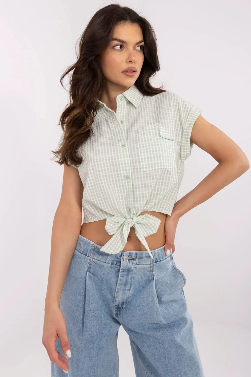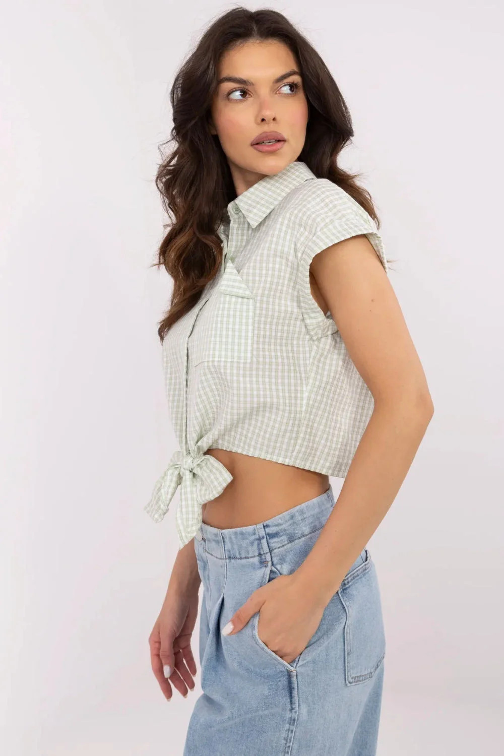 Dámská košile v kostkovaném casual stylu je stylovým a pohodlným návrhem pro každodenní outfit. Vyrobená z bavlněné směsi s polyuretanem, spojuje přirozenou prodyšnost s jemnou pružností, co zajišťuje pohodlné nošení. Krátká délka, krátký rukáv a ozdobné vázání dole jí dodávají lehkost a mladistvý charakter. Klasický límeček, zapínání na knoflíky a kapsa na hrudi zdůrazňují její praktický a zároveň módní styl. Kostkovaný vzor dělá košili skvělým doplňkem jak k džínům, tak k kraťasům.