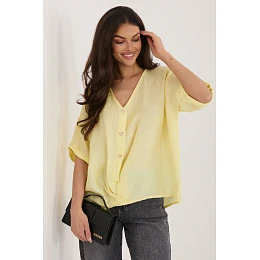 Dámská košile s lehkým a pohodlným střihem, ideální pro každodenní stylizace. Vyrobená z příjemné látky spojující viskózu a nylon, díky čemuž je materiál prodyšný, lehký a dobře padne na postavě. Model se vyznačuje různorodou strukturou materiálu, která dává košili zajímavý a stylový charakter. Košile nemá límeček, a srdcovitý výstřih jemně zdůrazňuje linii krku a dodává celku ženskou lehkost. Krátký rukáv zase zajišťuje, že se model skvěle hodí na teplejší dny. Standardní délka umožňuje nosit košili jak zasunutou do kalhot nebo sukně, tak volně. Zapínání na knoflíky je praktické a usnadňuje oblékání, zároveň je klasickým prvkem dokončení.