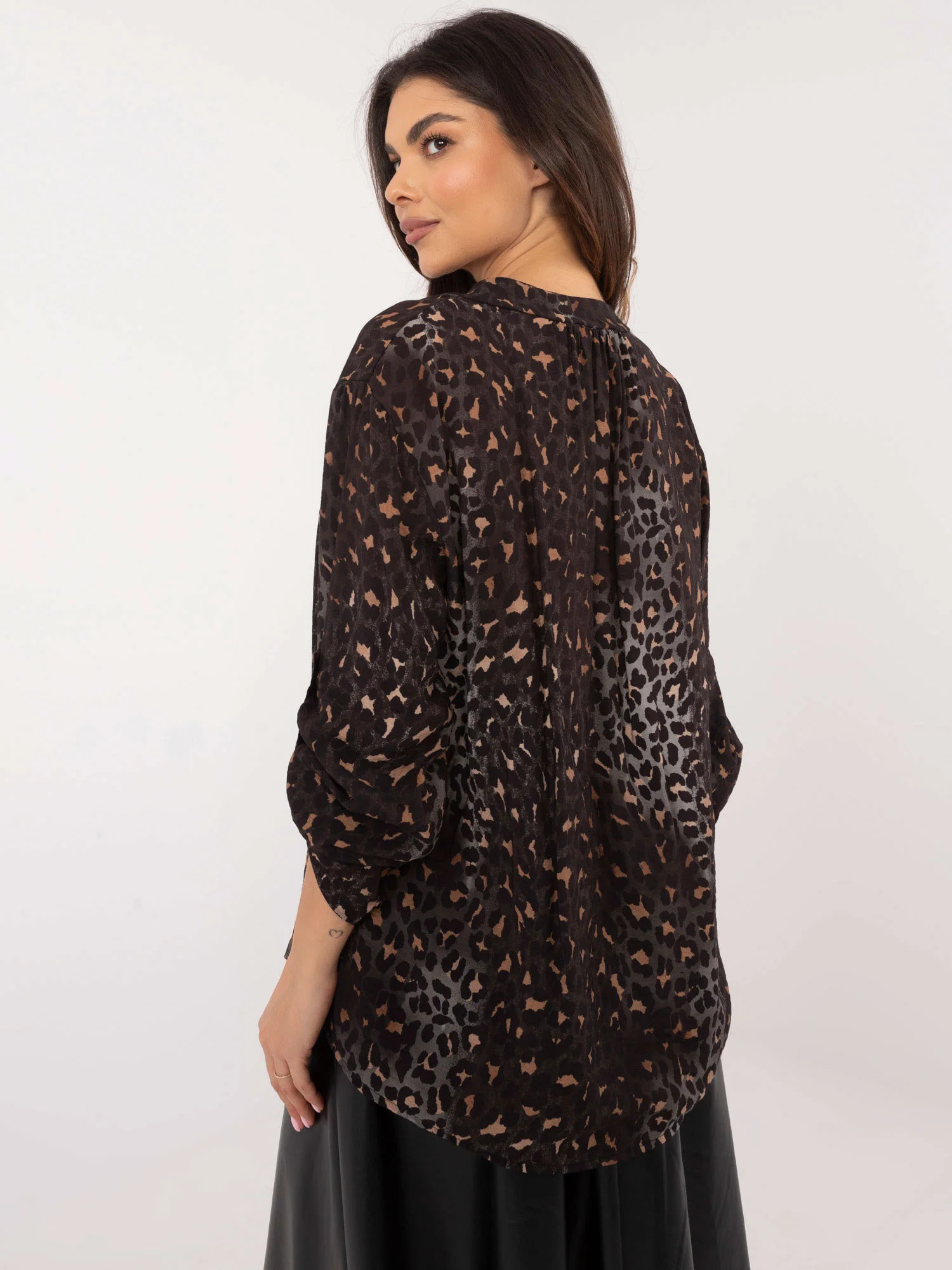 Rozměry halenky v jedné velikosti měřené na plocho: šířka v podpaží - 60 cm, celková délka - 78 cm, délka rukávu - 67 cm.