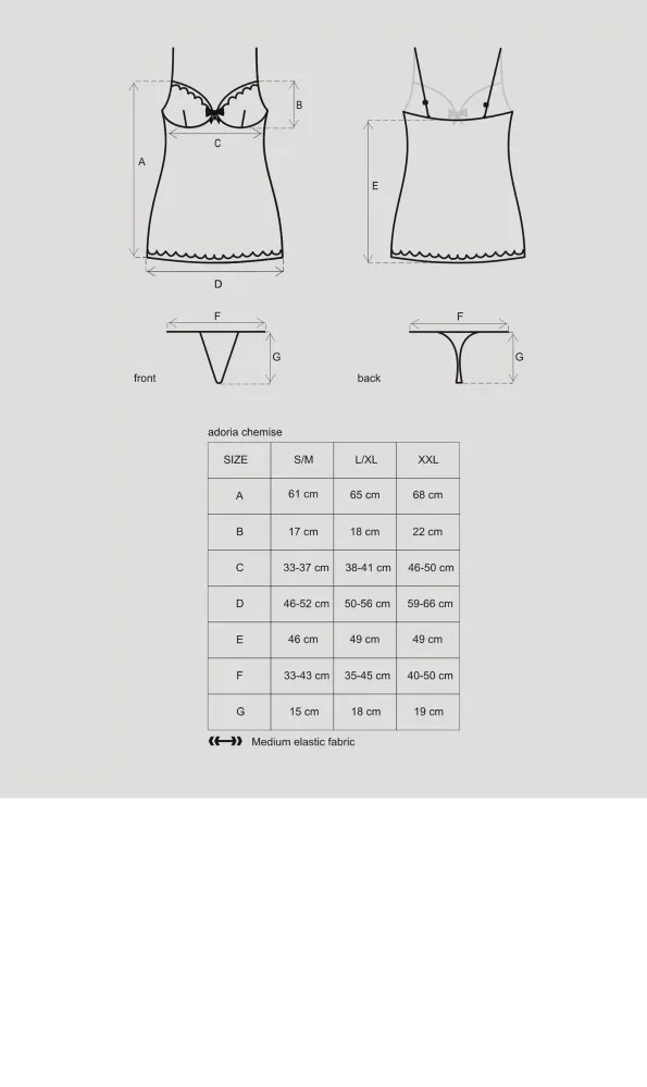 Snila jste někdy o žhavém a neobyčejně smyslné noci? Adoria chemise je k tomu ten pravý doplněk! Proč? Drobné puntíky a krajkové prvky budou na vaší postavě vypadat neuvěřitelně sexy! Stejně jako elegantní zdobení na prsou. Libí se vám to male srdíčko a mašlička? To je dobře, protože to právě ony vám splní vaše tajné sny!