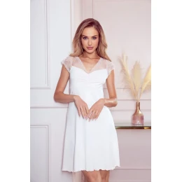 Noční košile broskvové barvy zdobená krajkou na ramenou. Mírně rozšířená ve spodní části, ve střihu do A. Výstřih je z ažurové síťoviny s ozdobným řasením uprostřed. Tkanina je měkká, pružná, příjemná na dotek. 92 % viskóza, 5 % polyamid, 3 % elastan.