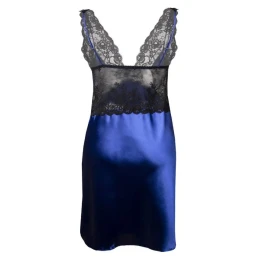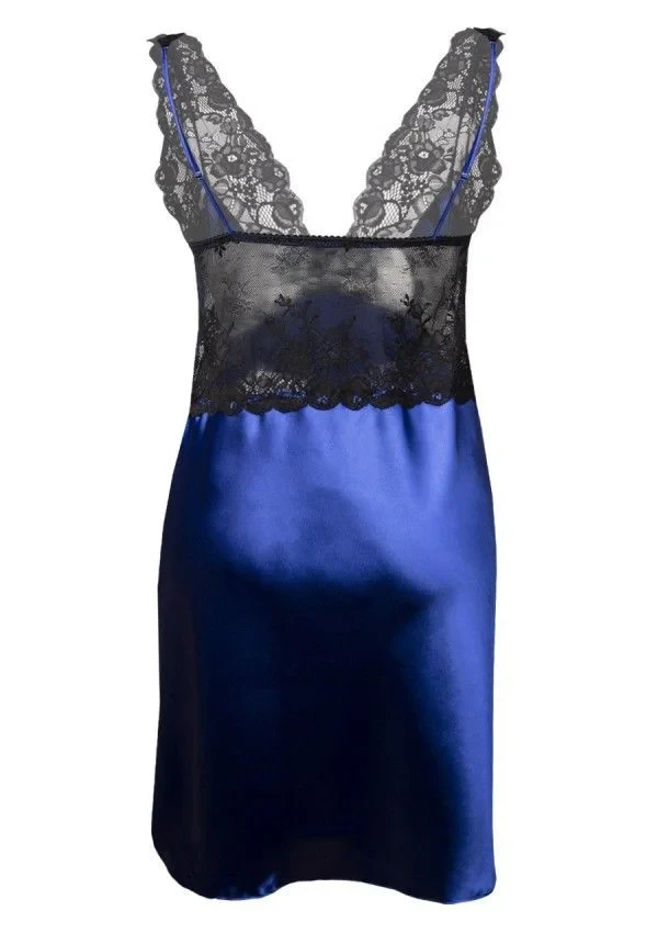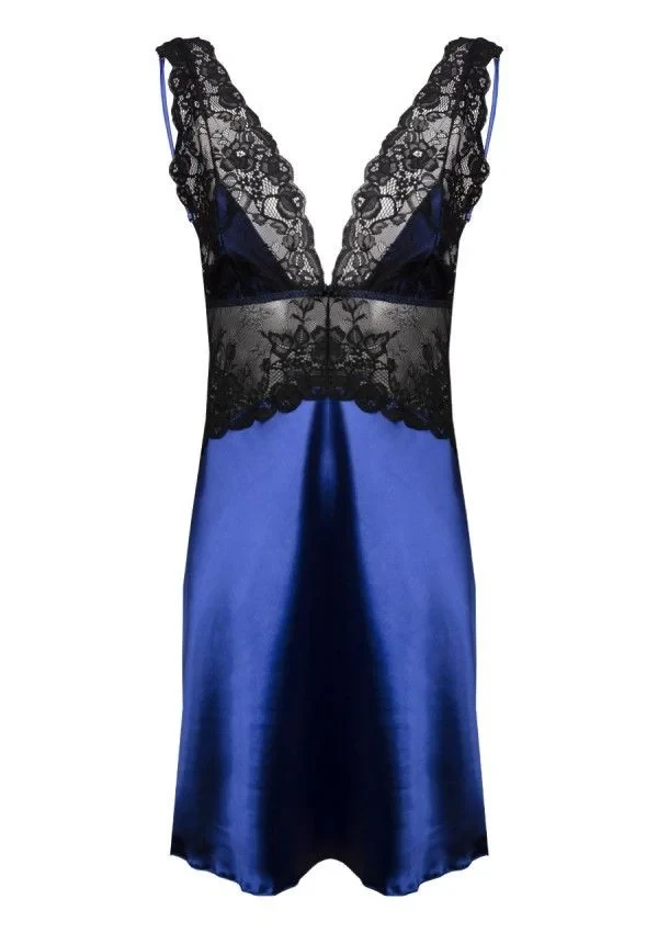 Elegantní tmavě modrá noční košilka s výraznou krajkovou vsadkou v černé barvě. Téměř poloviční satén a krajka umožnily v tomto provedení dosáhnout velmi smyslného efektu. Horní díl v podobě braletky skrývá měkké tenké košíčky a nastavitelná ramínka. Středová část se svůdným efektem vyklizení. Spodní část je volná, vzdušná a elegantní. Složení: 100% polyester.