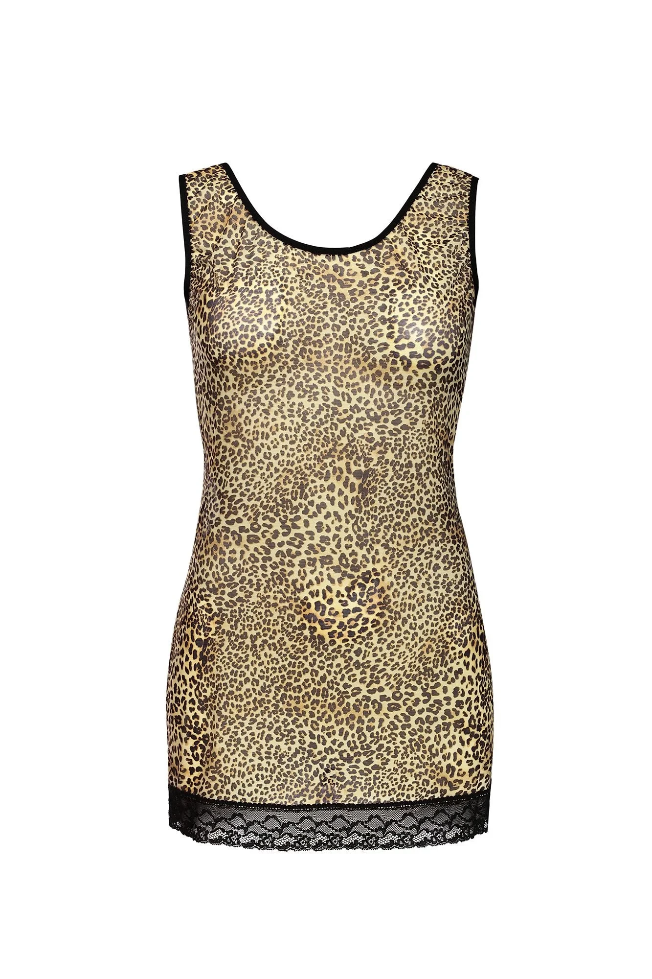 Sexy noční košilka s širšími ramínky z exkluzivního elastického tanninu, která zvýrazňuje postavu. V krásném teplém barevném provedení s motivem kočičích skvrn. Spodní část je zdobená jemnou černou krajkou. Elastická tkanina, jemně průhledná, sexy. Pohodlný, ženský střih. Složení: 80 % polyamid, 20 % elastan.