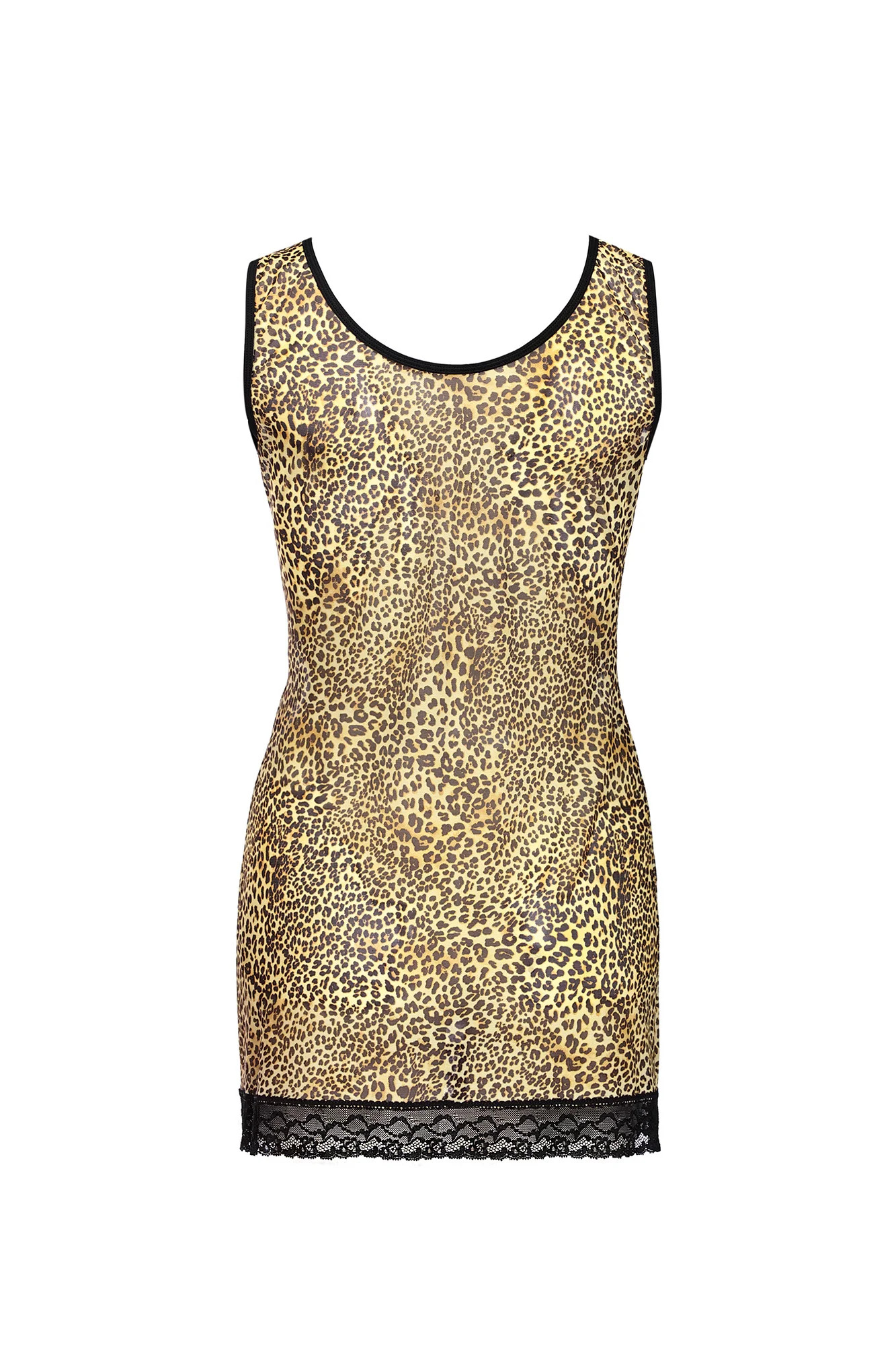 Sexy, postavu obepínající noční košilka na širších ramínkách z exkluzivního, elastického tanninu. V krásných, teplých barvách, s motivem kočičích skvrn. Spodní část je zdobená jemnou, černou krajkou. Elastická tkanina, jemně průsvitná, sexy. Pohodlný, ženský střih. 80 % polyamid, 20 % elastan.