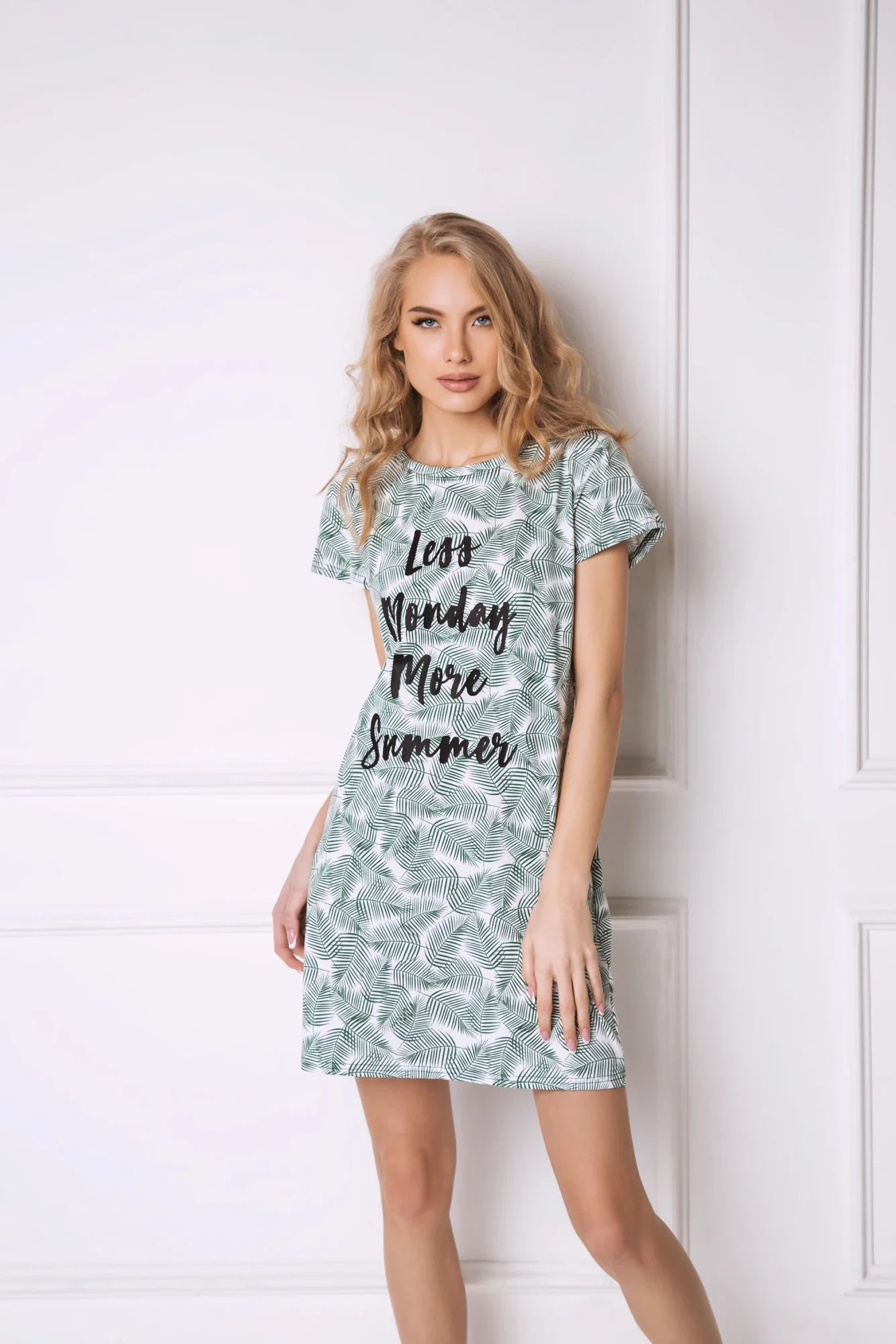 Nádherná vzpomínka na léto - tričko Tropics - pokryté potiskem zelených exotických palmových listů. Úhledný střih, mírně přiléhající k tělu, s krátkými rukávy. Na přední straně nápis "Méně pondělí, více léta". Složení: 100% bavlna.