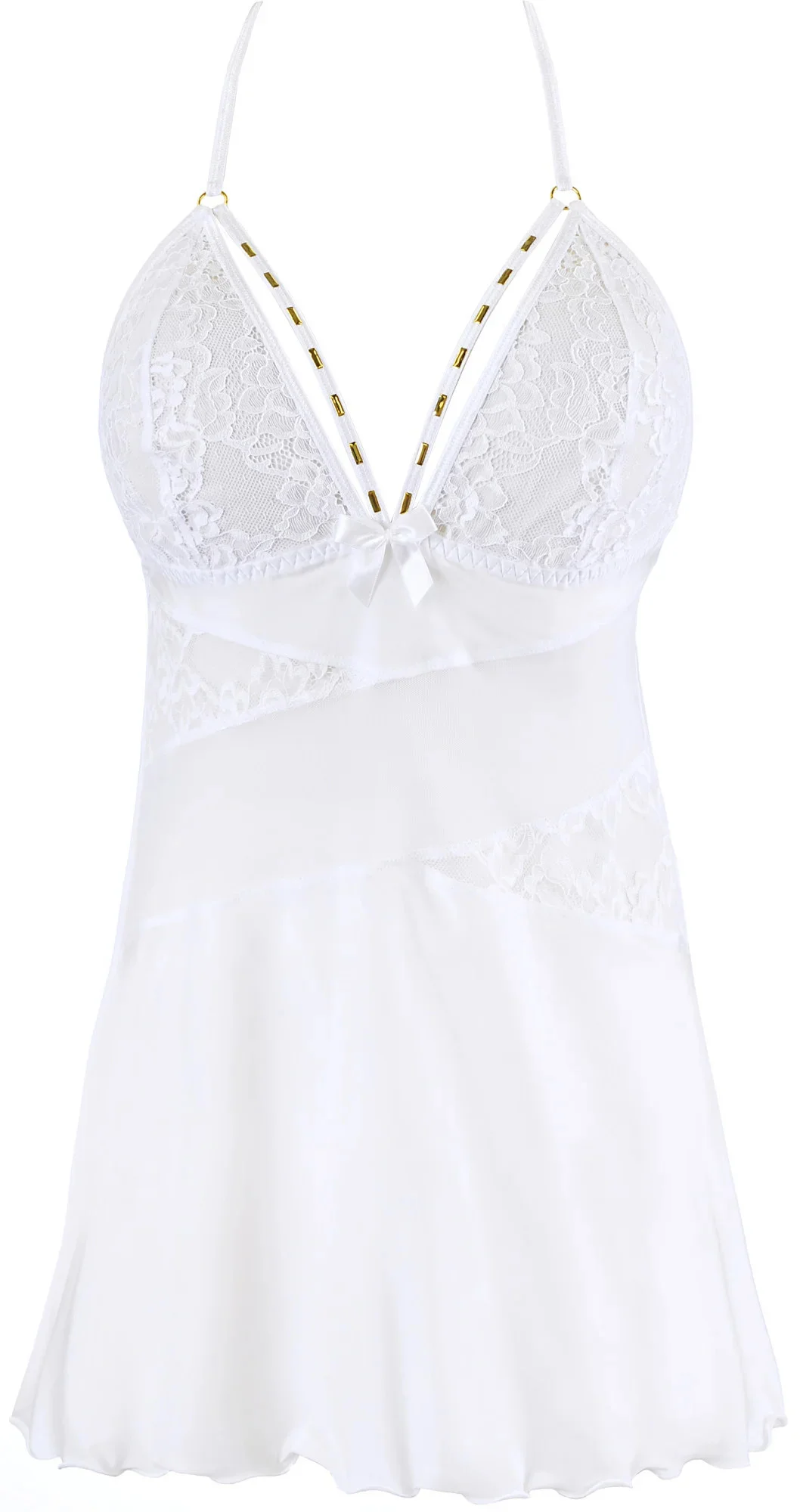 Objevte svou svobodu v naší efektní, bílé babydoll s bohatě zdobenými proužky na dekoltu. Každá má doplňky ve zlaté barvě, které zvýrazní vaše tělo. Celek je vyroben z velmi jemného a pružného mikrovlákna, s krajkovými vsadkami. Obvod kolem prsou na odpovídajícím pásku, ramínka se vzadu kříží, nejsou odepínací, ale dají se nastavit. Ke každé naší babydoll přidáváme zdarma kalhotky, elastické, ze stejného materiálu, zdobené ornamentem ve zlaté barvě. Součástí kompletu jsou tanga. Materiálové složení: Polyamid 82 %, Elastan 17 %, Bavlna 1 %