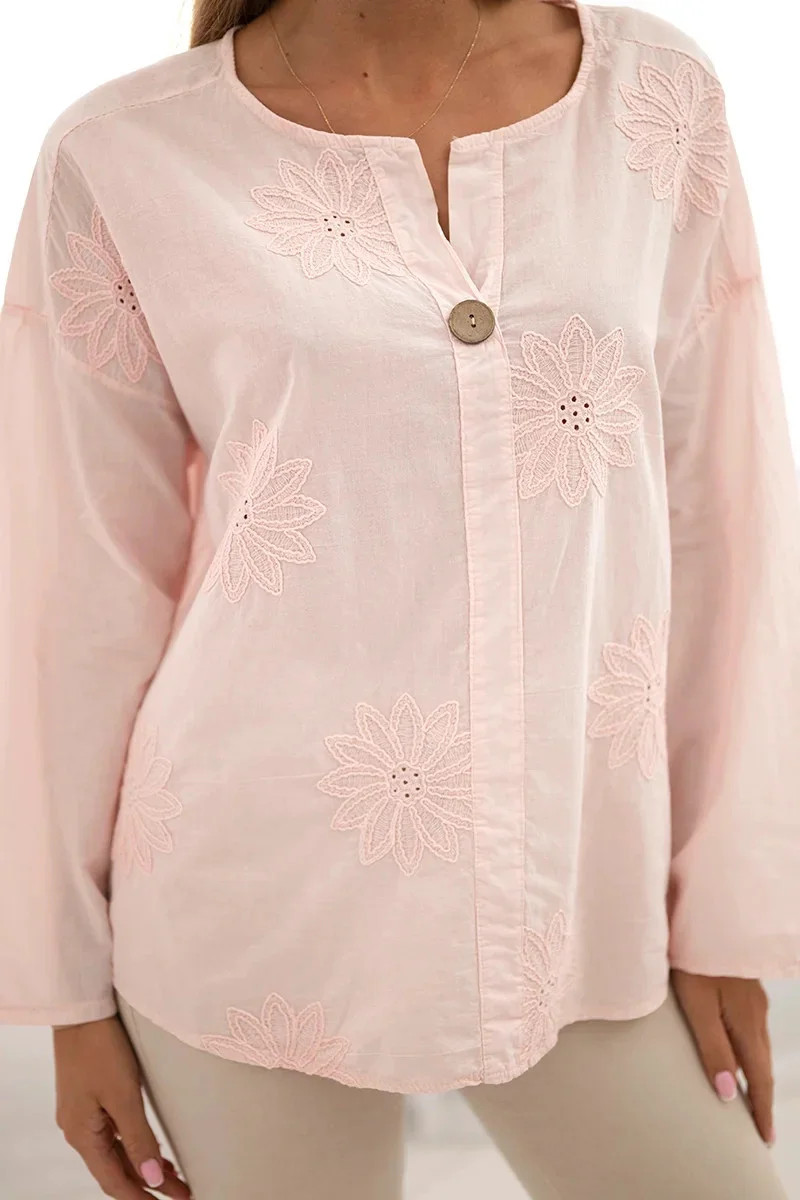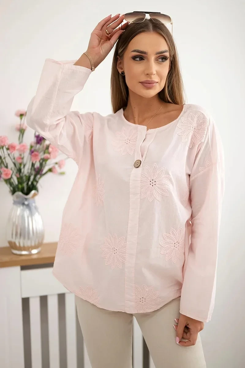 Košilová halenka s vyšívaným vzorem pudrově růžová