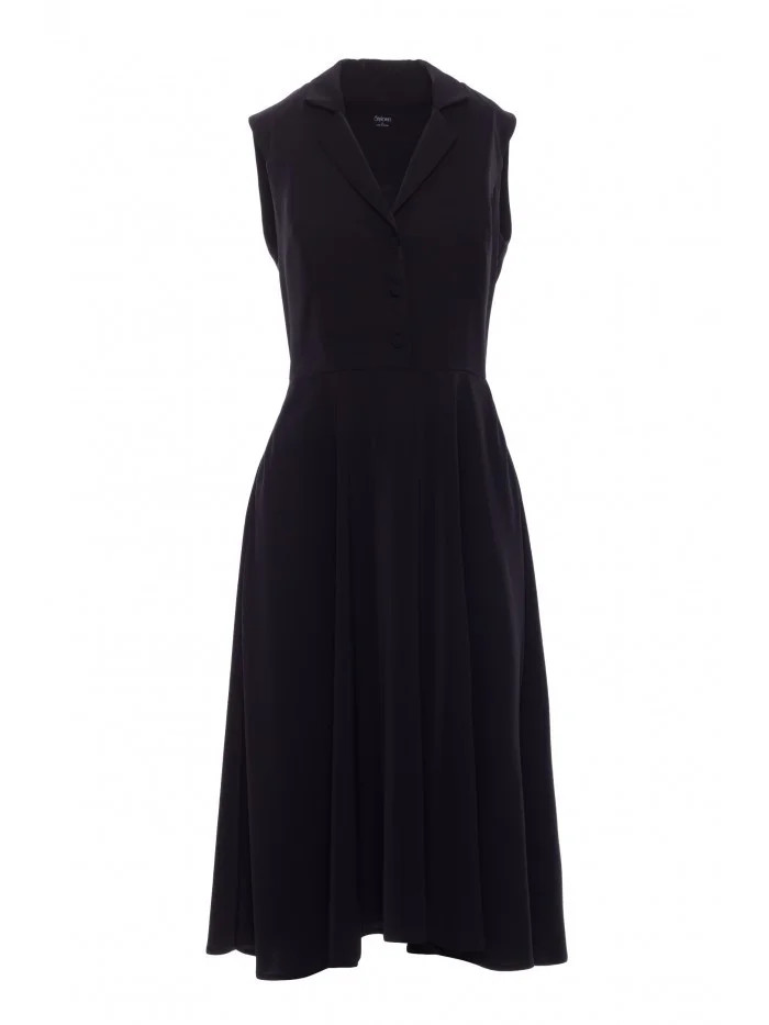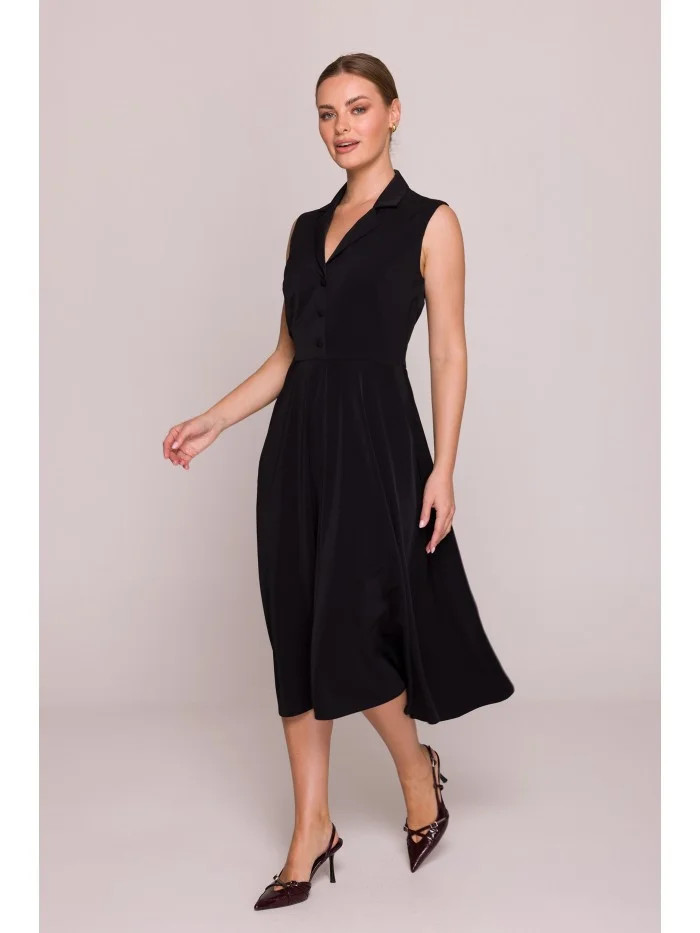 materiál: 95% polyester 5% elastan Materiál: hladká tkanina s jemným leskem PODROBNOSTI O PRODUKTU Výstřih: hluboký výstřih do V s klasickým límcem Rukávy: bez rukávů Zapínání: skrytý boční zip, zapínání na knoflíky Kapsy: boční kapsy Podšívka: žádná Model: S409 Navrženo a vyrobeno v Polsku Modelka je vysoká 170 cm a má na sobě velikost S STYL A STŘIH Střih: vypasovaný top s rozšířenou sukní Tvar: vypasovaný střih, vymezený pas