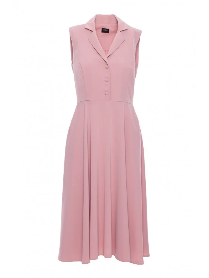 materiál: 95% polyester 5% elastan Materiál: hladká tkanina s jemným leskem PODROBNOSTI O PRODUKTU Výstřih: hluboký výstřih do V s klasickým límcem Rukávy: bez rukávů Zapínání: skrytý boční zip, zapínání na knoflíky Kapsy: boční kapsy Podšívka: žádná Model: S409 Navrženo a vyrobeno v Polsku Modelka je vysoká 170 cm a má na sobě velikost S STYL A STŘIH Střih: vypasovaný top s rozšířenou sukní Tvar: vypasovaný střih, vymezený pas