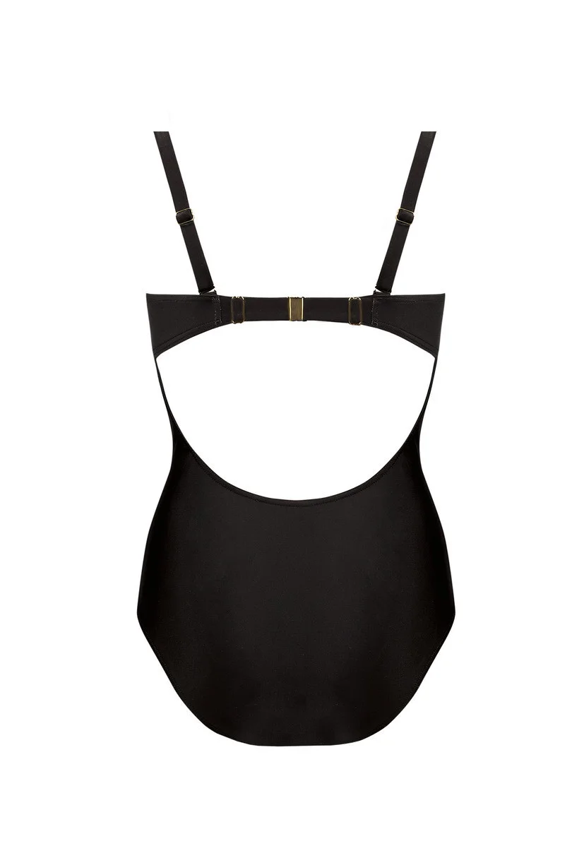 Jednoczęściowy elegancki kostium kąpielowy wykonany został z wysokiej jakości gładkiej dzianiny i przezroczystej siateczki. Posiada miseczki usztywnione, tył z zapięciem jak biustonosz, ramiączka z regulacją, odpinane tylko z tyłu.