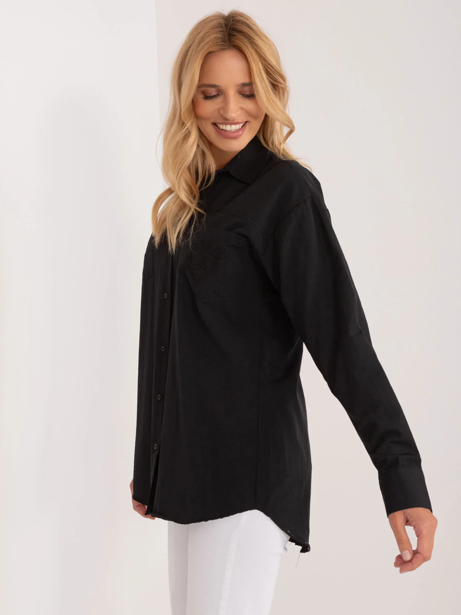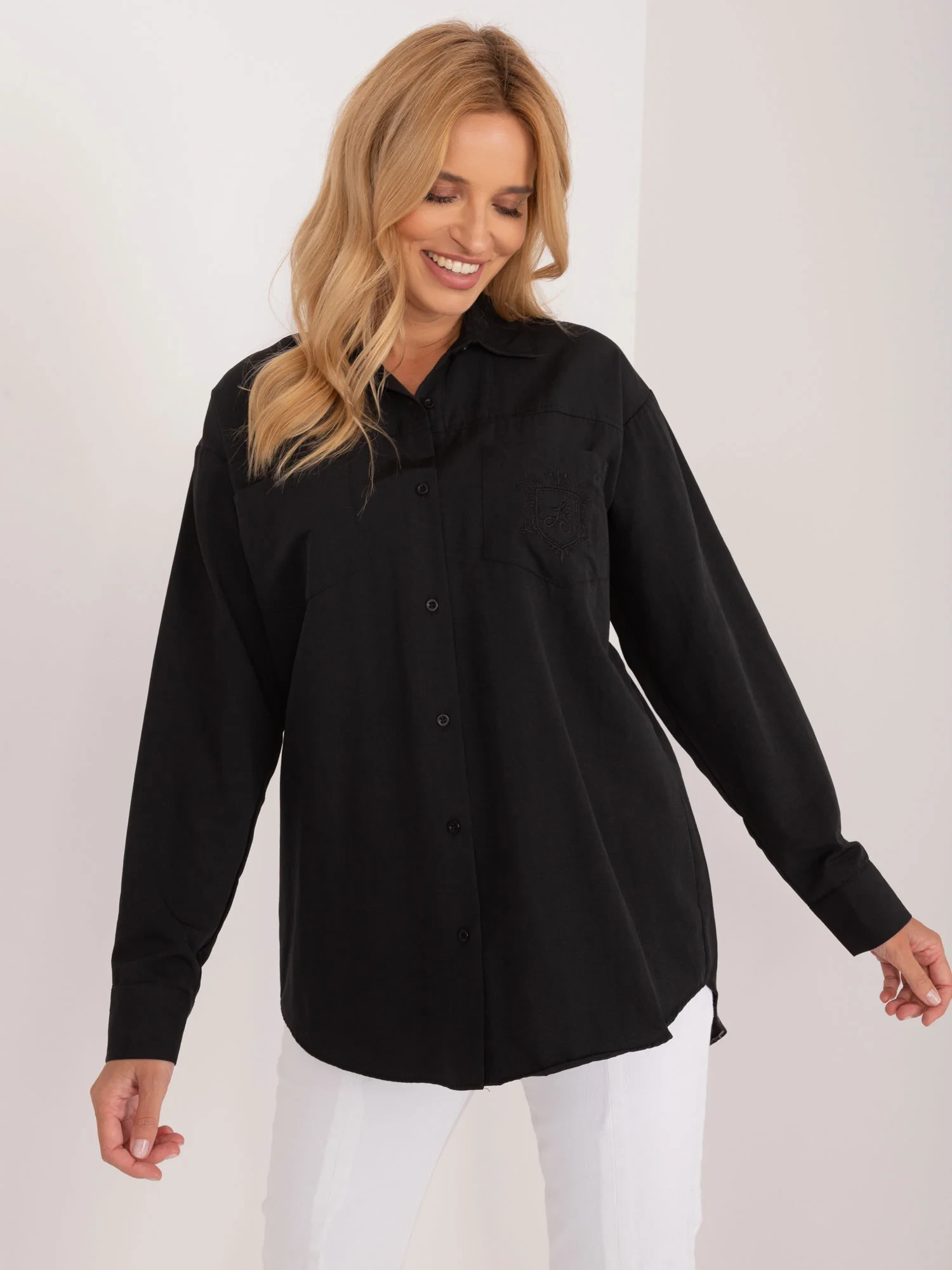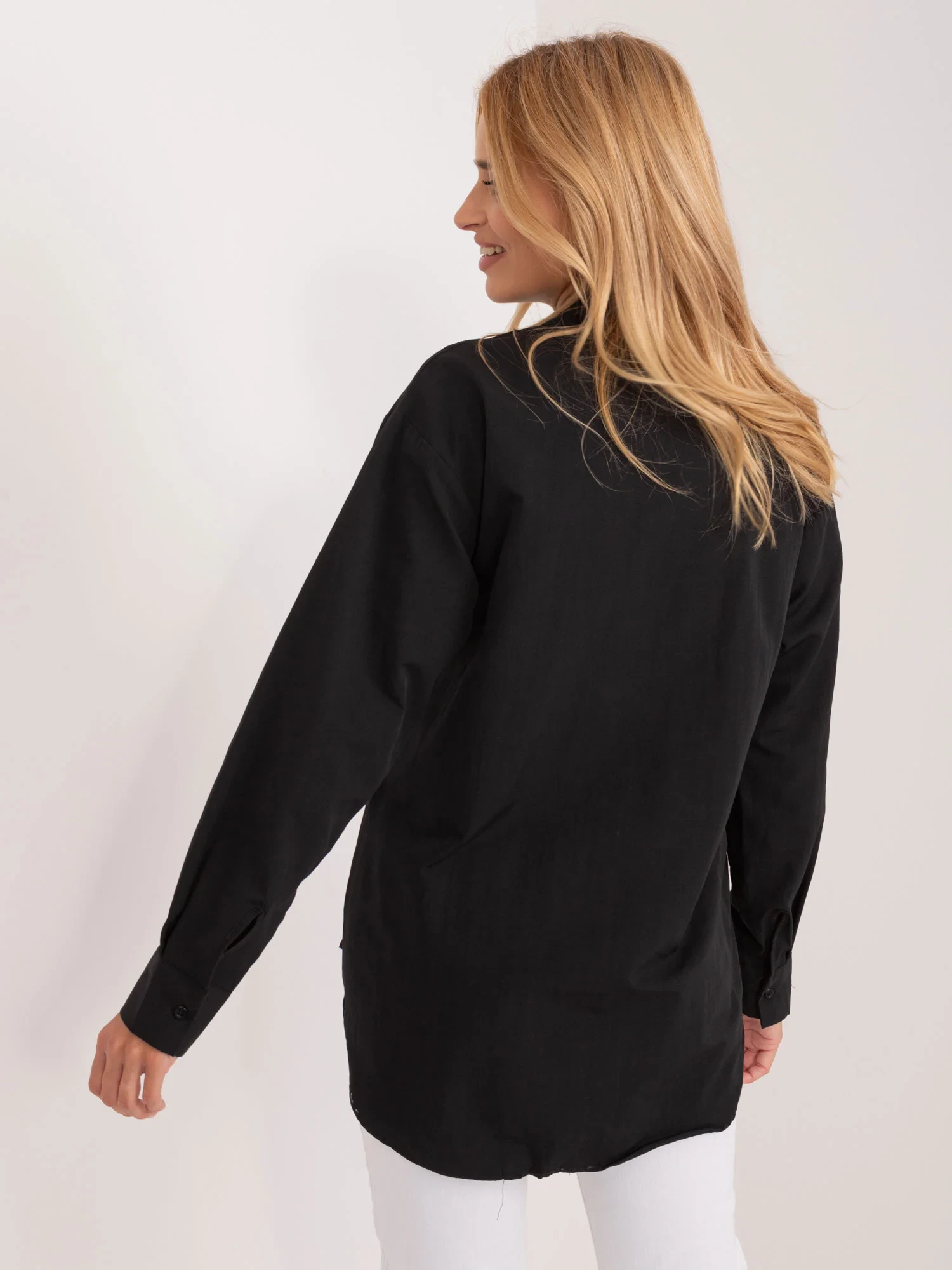Wymiary koszuli w rozmiarze S mierzone na płasko: szerokość pod pachami - 51 cm, długość rękawa - 61 cm, długość całkowita (przód) - 65 cm, długość całkowita (tył) - 72 cm.