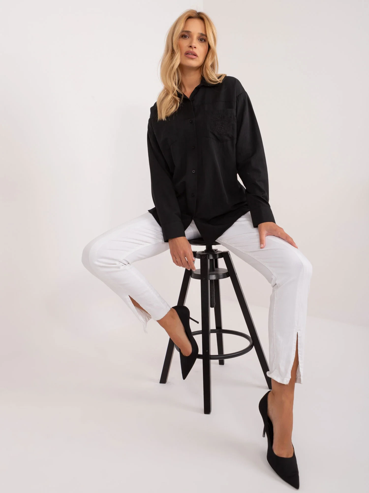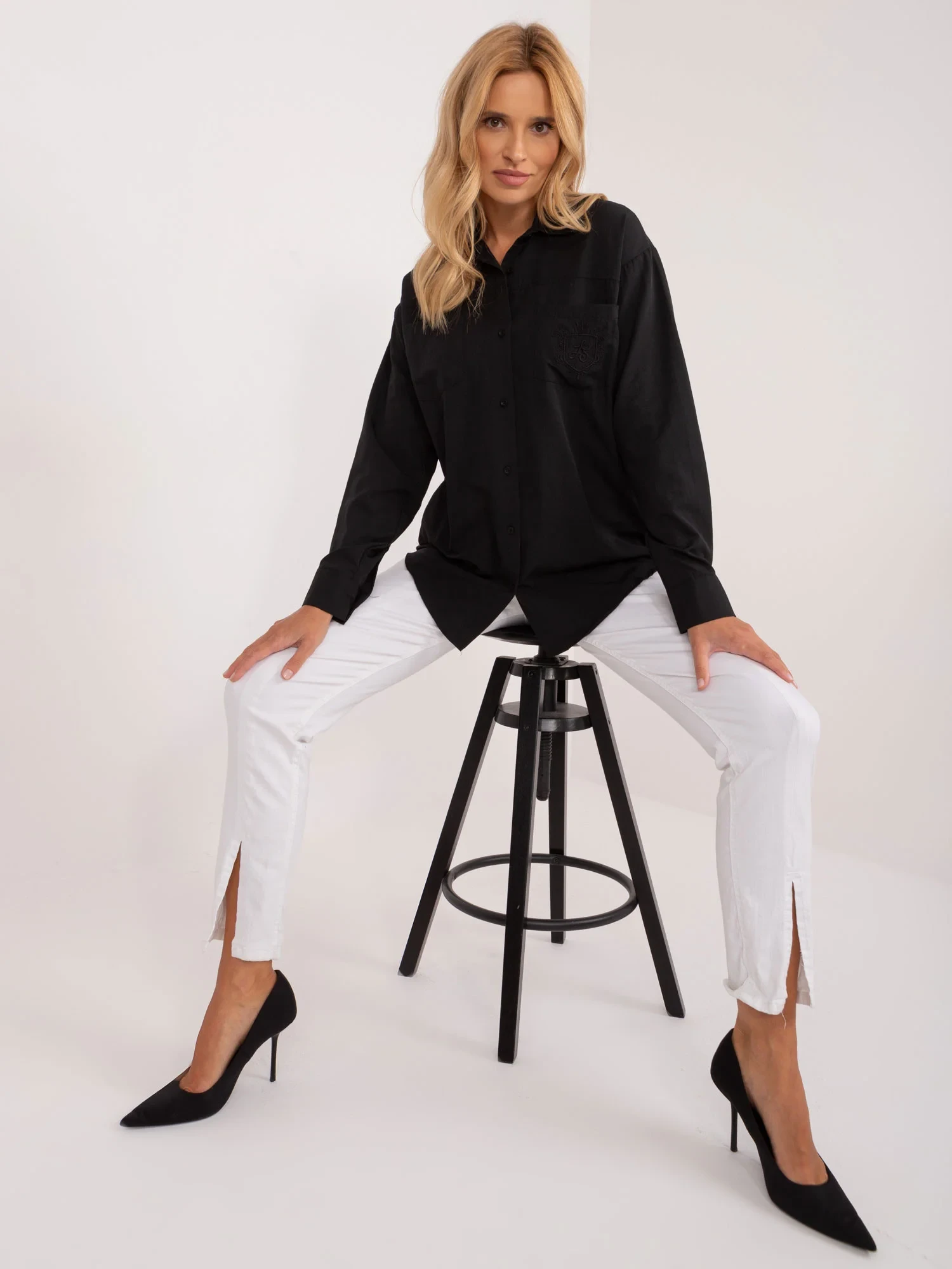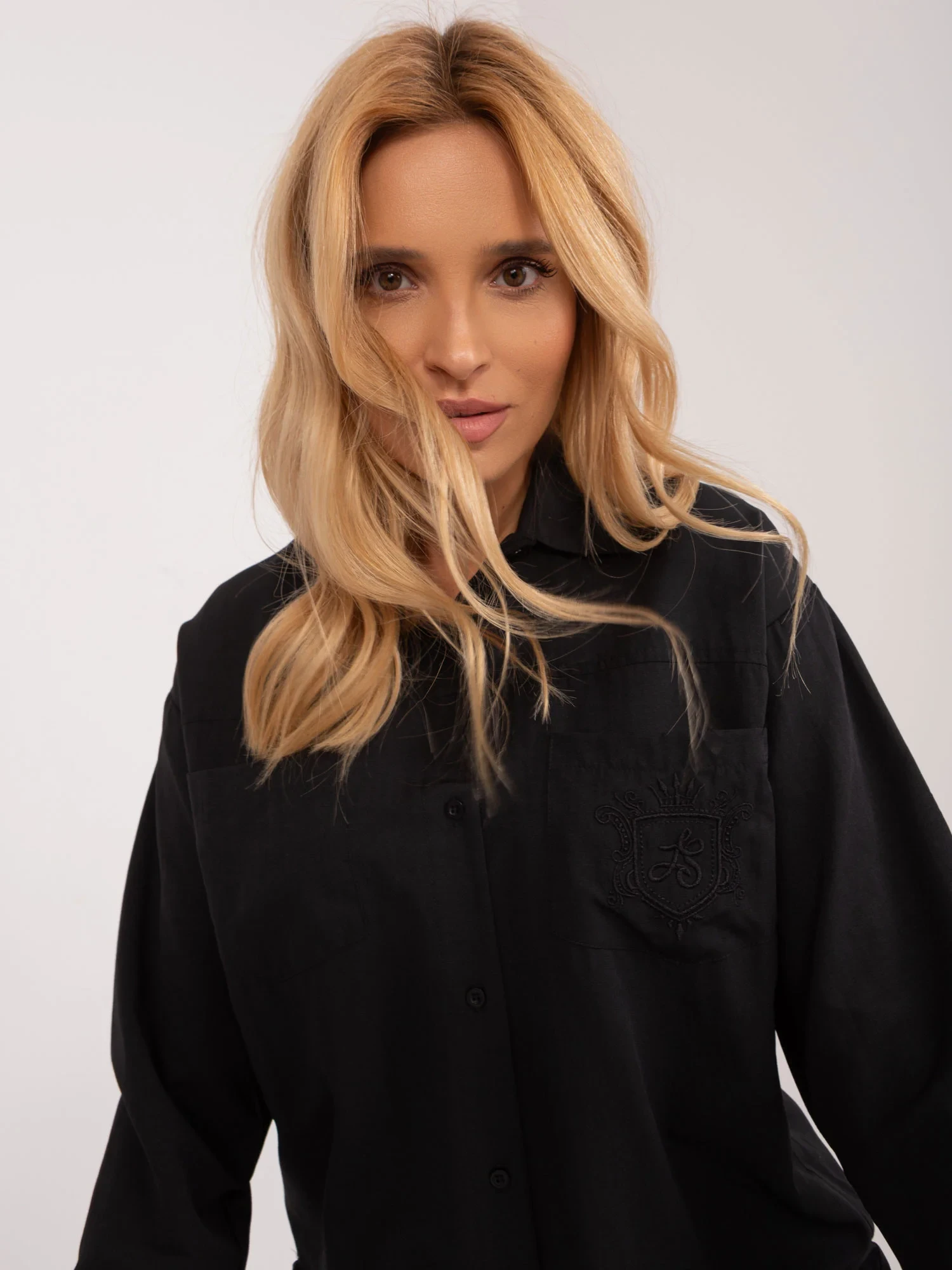 Wymiary koszuli w rozmiarze S mierzone na płasko: szerokość pod pachami - 51 cm, długość rękawa - 61 cm, długość całkowita (przód) - 65 cm, długość całkowita (tył) - 72 cm.