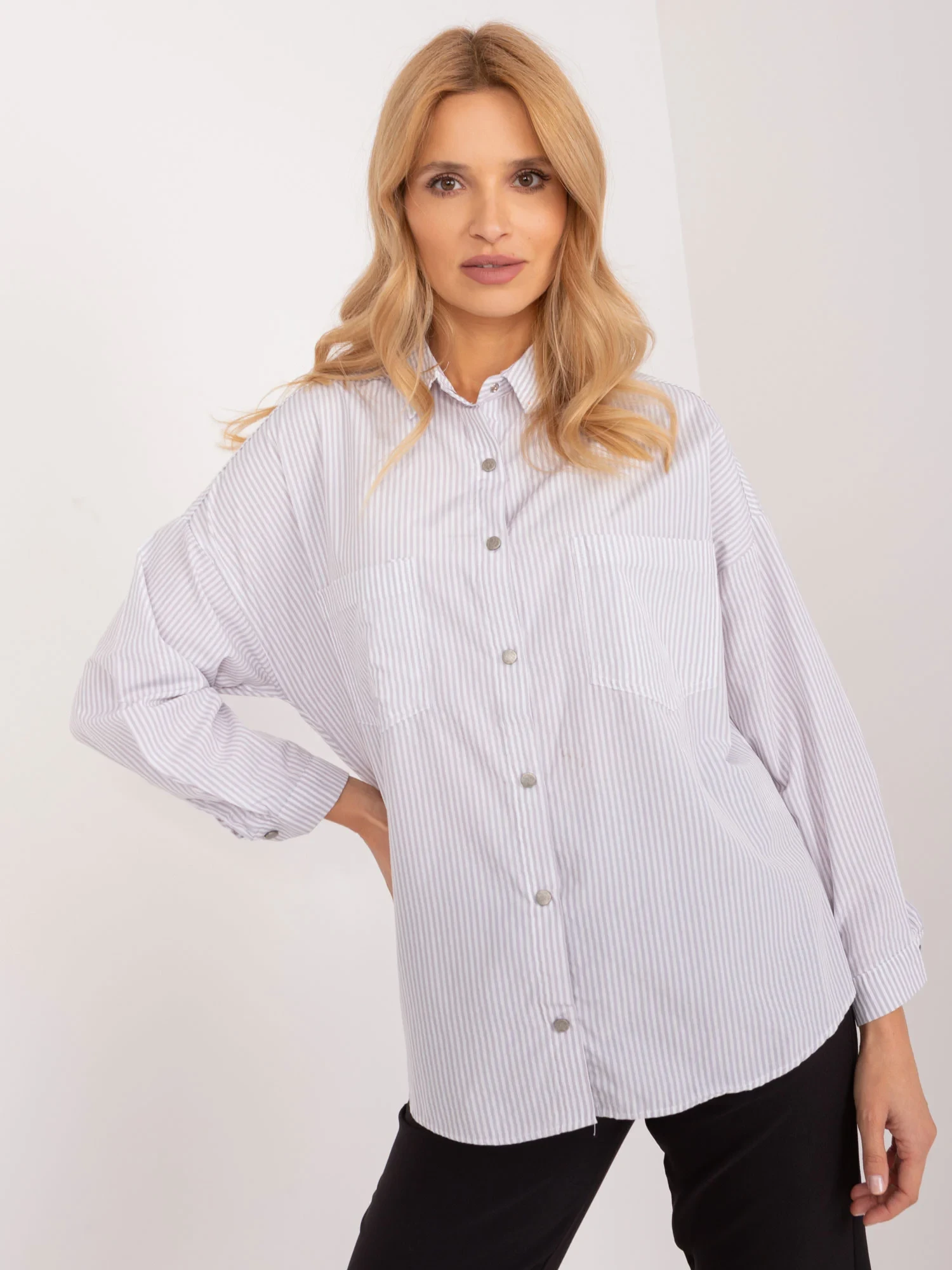 Wymiary koszuli w rozmiarze S mierzone na płasko: szerokość pod pachami - 62 cm, długość rękawa - 55 cm, długość całkowita (przód) - 65 cm, długość całkowita (tył) - 73 cm.