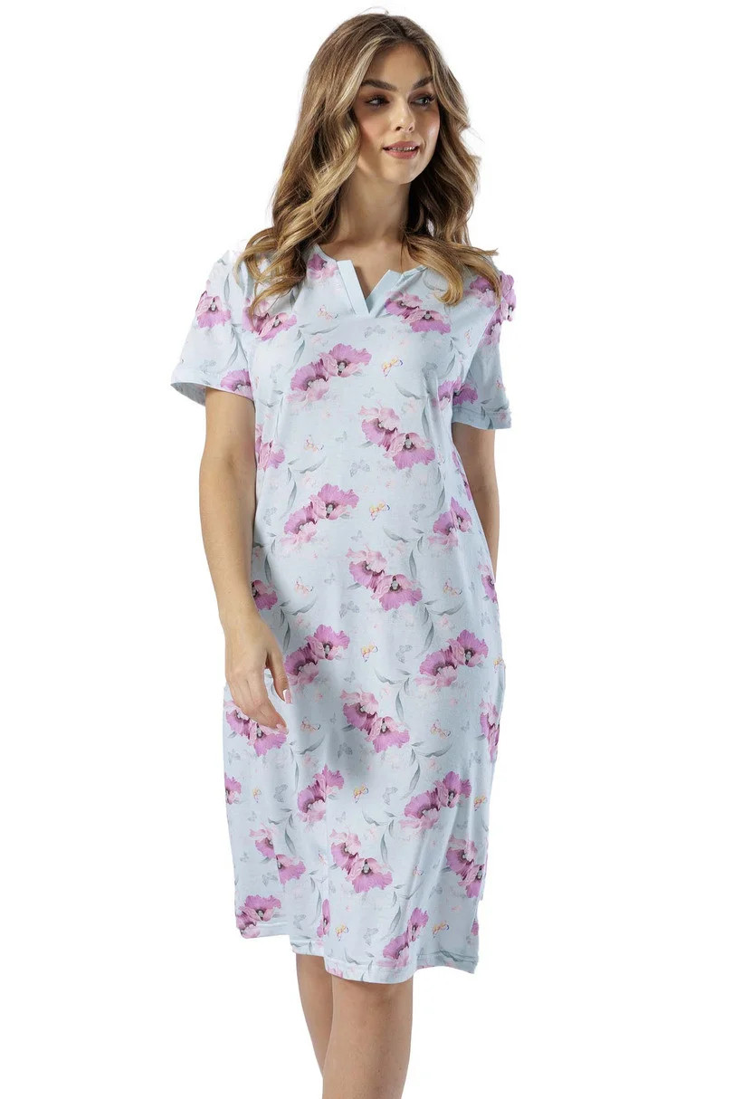 Dámské tričko s krátkým rukávem, vyrobené z měkké bavlny s květinovým vzorem, s kulatým výstřihem, s kontrastní zadní stranou ve tvaru V, délka trička: ke kolenům.