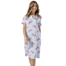 Dámské tričko s krátkým rukávem, vyrobené z měkké bavlny s květinovým vzorem, s kulatým výstřihem, s kontrastní zadní stranou ve tvaru V, délka trička: ke kolenům.