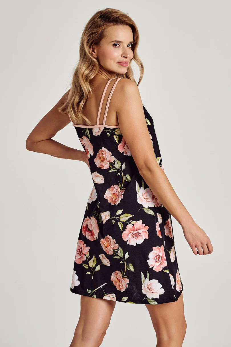 Dámské spodní tričko s úzkým páskem ušité ze vzorované jemné bavlny. Měkký špičatý výstřih, délka košile před kolena.