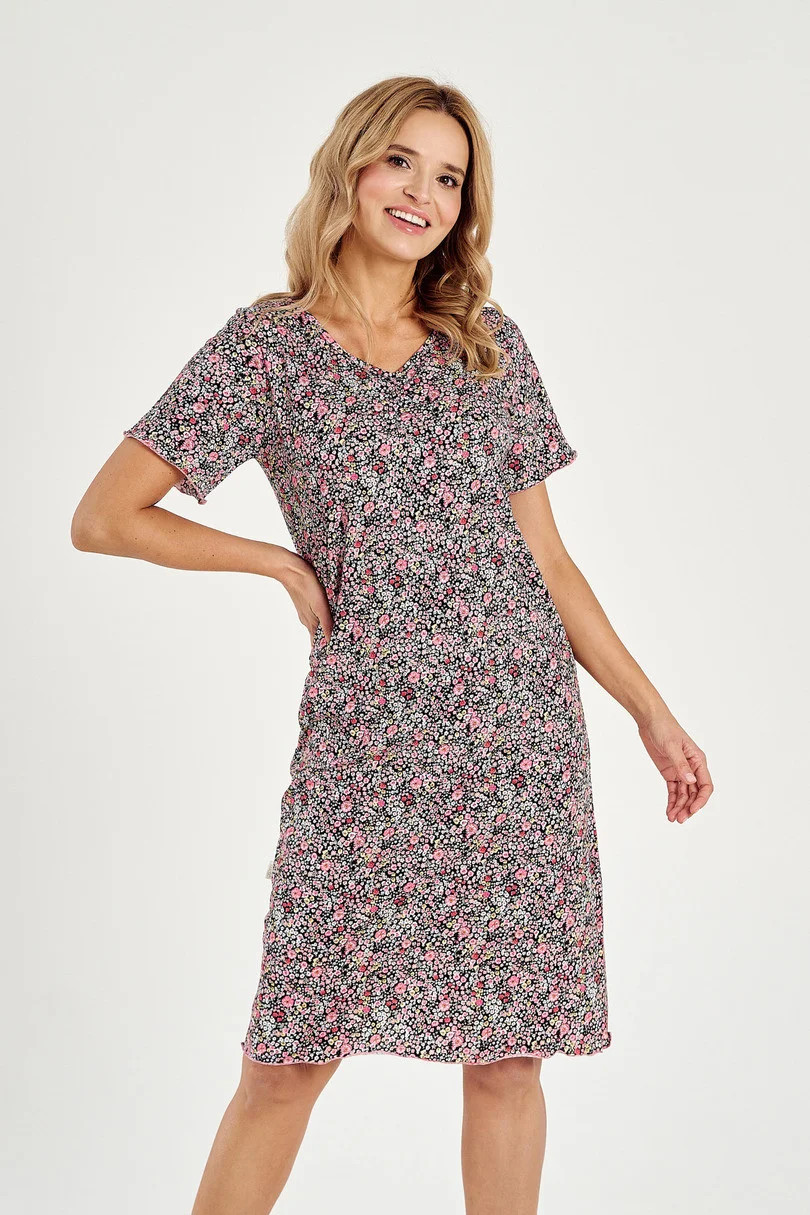 Dámské tričko s krátkým rukávem ušité ze vzorované jemné bavlny. Košile s výstřihem do V a délkou ke kolenům.