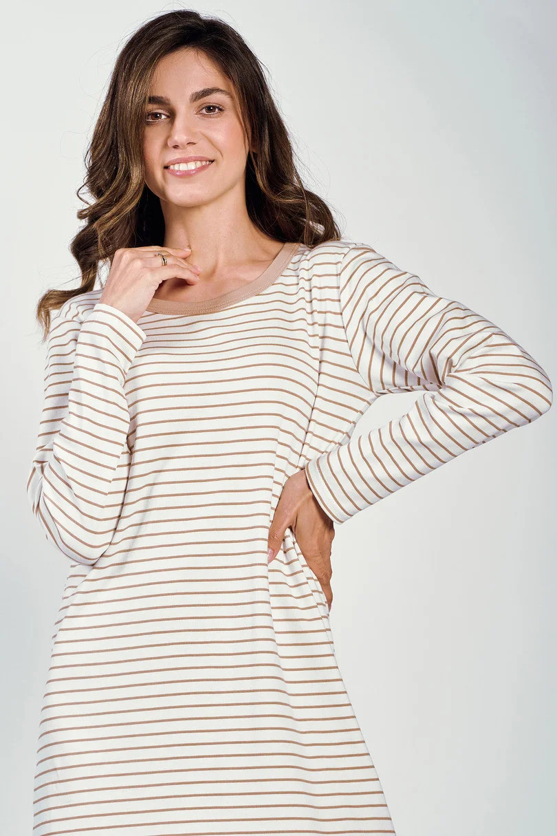 Dámská košile s dlouhými rukávy, vyrobená z hřejivé bavlny Interlook s proužky. Kulatý výstřih. Délka košile ke kolenům.