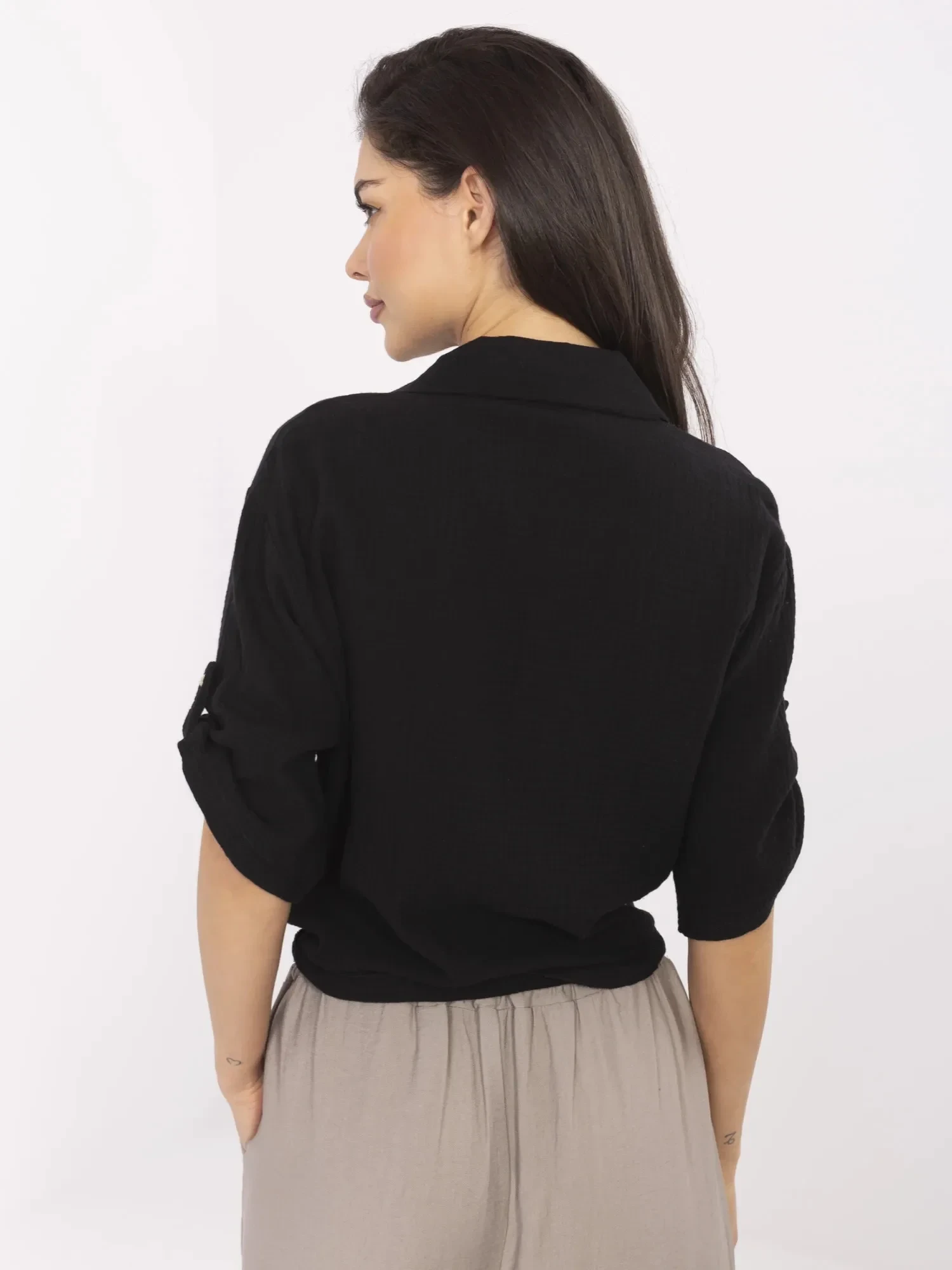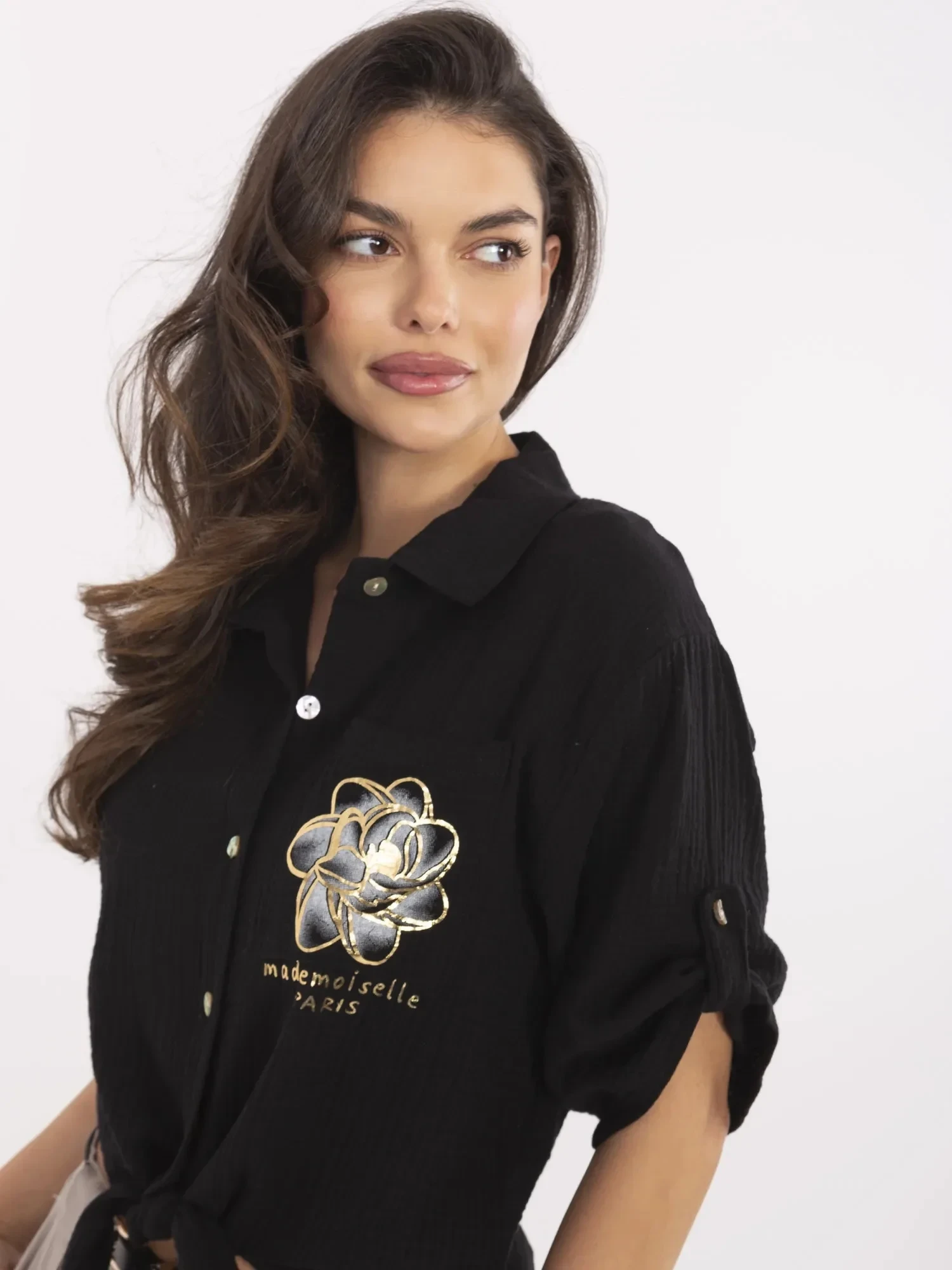Wymiary koszuli w rozmiarze one size mierzone na płasko: szerokość pod pachami - 54 cm, długość rękawa - 29 (od szwu), długość całkowita - 58 cm, szerokość w biodrach - 48 cm.